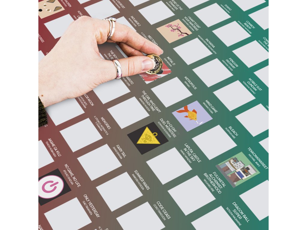 100 Anime Poster The perfect gift for any anime fanatic, this bucket list contains 100 animated, Japanese masterpieces from charming family films to long running adventure series. Every time you watch an anime on the list, scratch off its square to reveal a fun illustration.Doplňkové parametry
