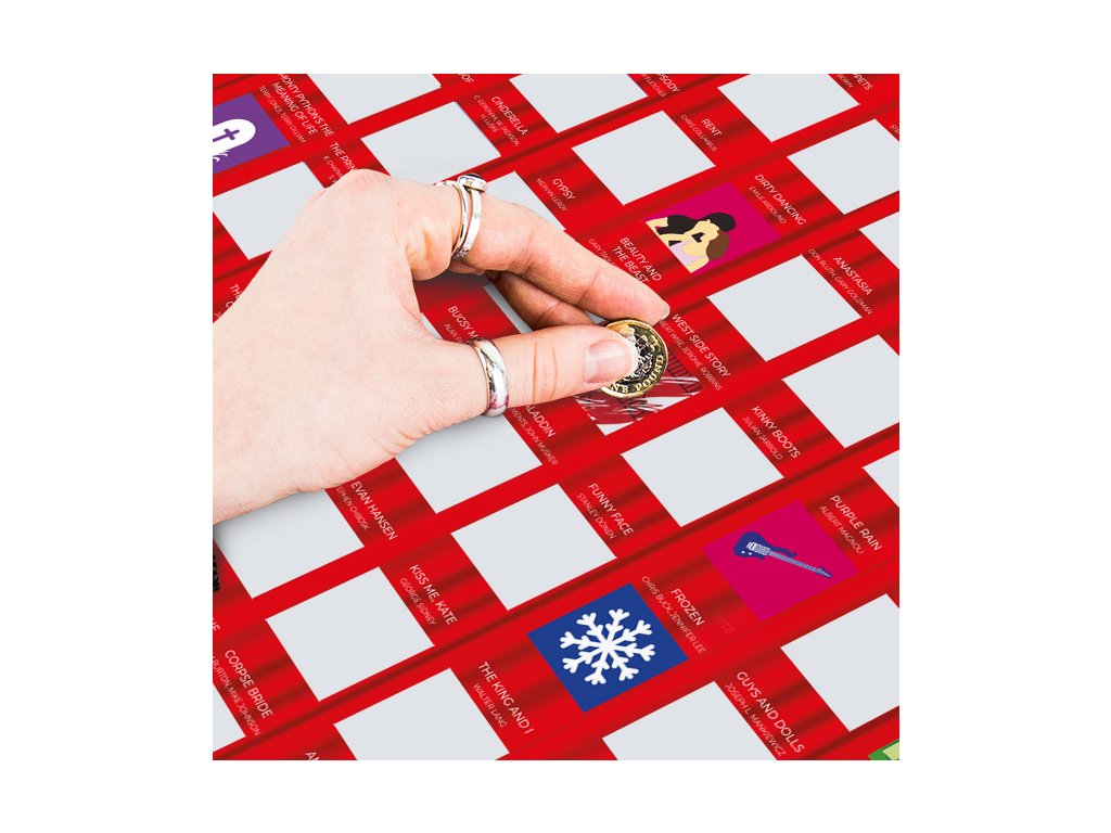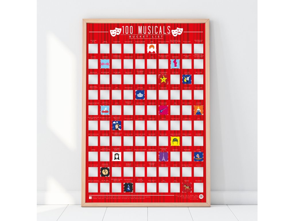 _ Description: The perfect gift for any musical fanatic, this bucket list contains 100 musicals you can watch from the comfort of your home. How many have you watched? Dims: 46x8.5x8cm Product Info: Scratch off posterDoplňkové parametry
