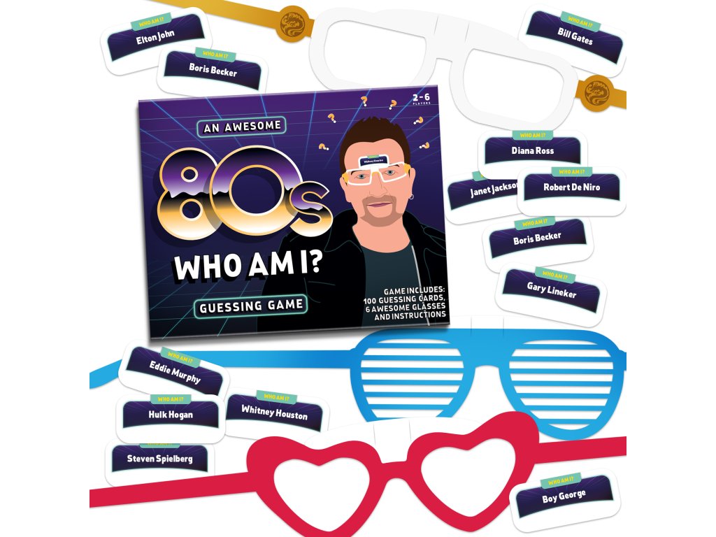 80s who am I? The Guessing Game Description: Take yourself back to the most awesome decade filled with some of the most iconic, captivating sports stars and celebrities from the 80s. The game includes guessing cards and sets of paper glasses to wear as you try to guess. Dims: 17.5x14x3.5cm Product Info: 100 cards, 6 glasses and instructions. Cardboard boxDoplňkové parametry