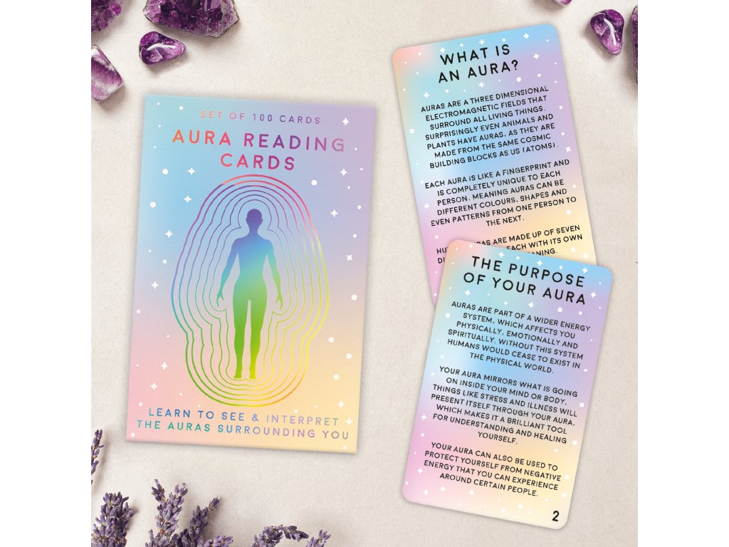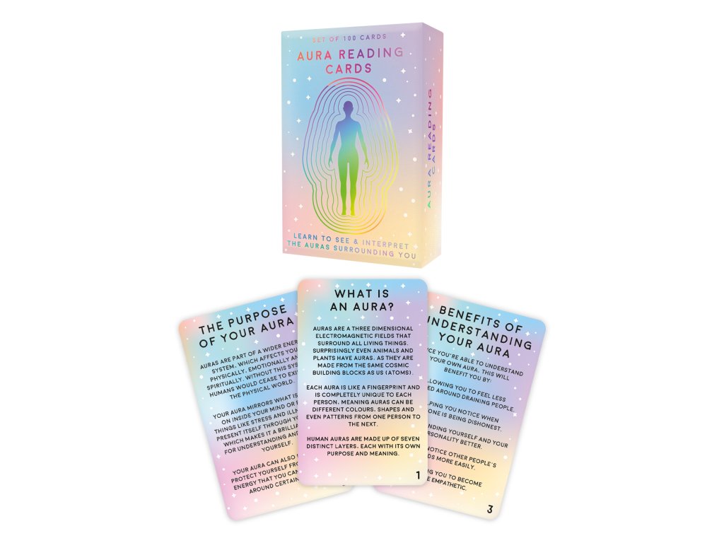 Aura Reading Cards Description: Are you ready to start seeing and reading auras? These cards are filled with knowledge and activities to teach you everything about auras and how we can use them to improve our physical, mental and spiritual health. Dims: 21x16x12cm Product Info: 100 cardsDoplňkové parametry