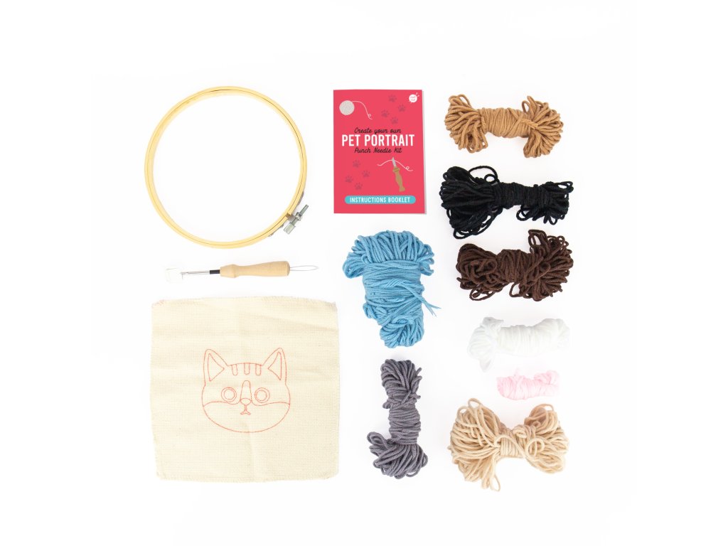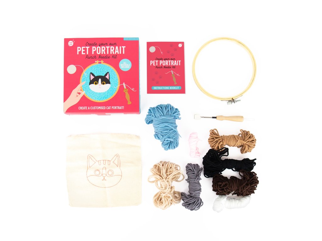 Cat Pet Portraits Description: Get ready to embark on a purr-fectly delightful crafting adventure with this Punch Needle Kit! Unleash your creativity as you create a majestic kitty masterpiece one tuft at a time. Yarn colours included: blue, pink, yellow, black, orange, brown, grey and white. This allows you to select from the colours to create a customised cat portrait. Dims: 18x18x5cm Product Info: Includes: 1 embroidery hoop (14.5cm), 8 different yarn colours, 1 punch needle tool, 2 punch needle threaders, 1 monks cloth, 3 template dog designs (see above) and full instructions.Doplňkové parametry