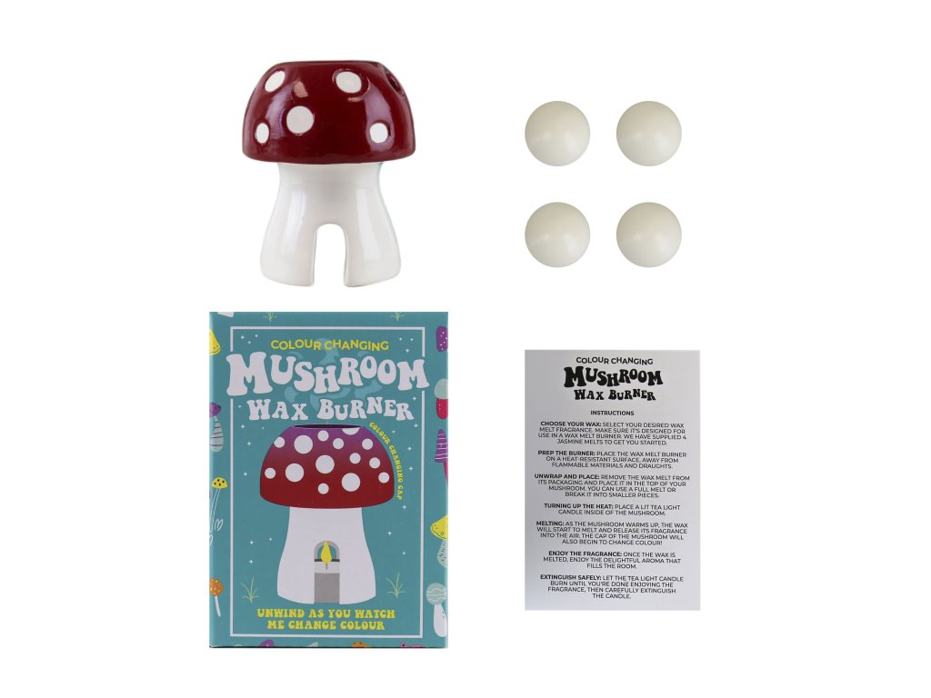 Colour changing mushroom wax burner Description: unwind and relax as this magical colour changing mushroom wax burner guides you into another world with its enchanting jasmine aroma. Packaging: Fluted Cardboard Box Dims:12x8.5x8.5cm Product Info: 1x colour changing Mushroom wax burner, 1x instructions & 4x vegan wax melts (jasmine scented).Doplňkové parametry