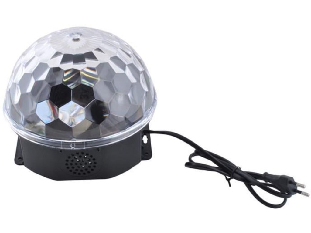 Disco koule má 6 silných, barevných LED diod (červená, zelená, modrá, žlutá, růžová, bílá), které se otáčejí vestavěným motorem a blikají podle rytmu hudby. Má vestavěný zvukový senzor. Připojená koule také svítí bez přehrávání hudby emise různých vzorů (schopnost změnit vzor stisknutím). Kompaktní světelný efekt LED reprodukuje svůj automatický světelný program. Vytváří neobvyklé pozadí na stěnách a stropech. Je možná montáž na zeď a na strop. Projektor má otvory, skrz které budou koule připevněny ke stropu nebo ke zdi. Může být také umístěn kdekoli bez trvalé montáže.