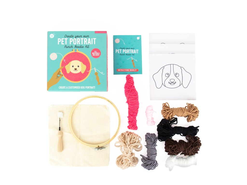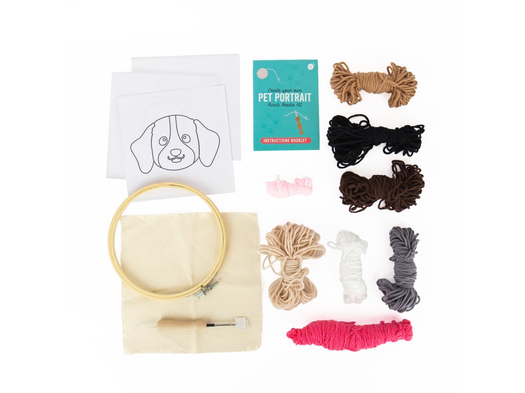 Dog Pet Portraits Description: Get ready to embark on an absolutely paw-some crafting adventure with this Punch Needle Kit! Unleash your creativity as you create a doggy masterpiece one tuft at a time. Yarn colours included: bright pink, pastel pink, beige, cream, white, grey, black and brown. This allows you to select from the colours to create a customised dog portrait. Dims: 18x18x5cm Product Info: Includes: 1 embroidery hoop (14.5cm), 8 different yarn colours, 1 punch needle tool, 2 punch needle threaders, 1 monks cloth, 3 template dog designs (see above) and full instructions.Doplňkové parametry