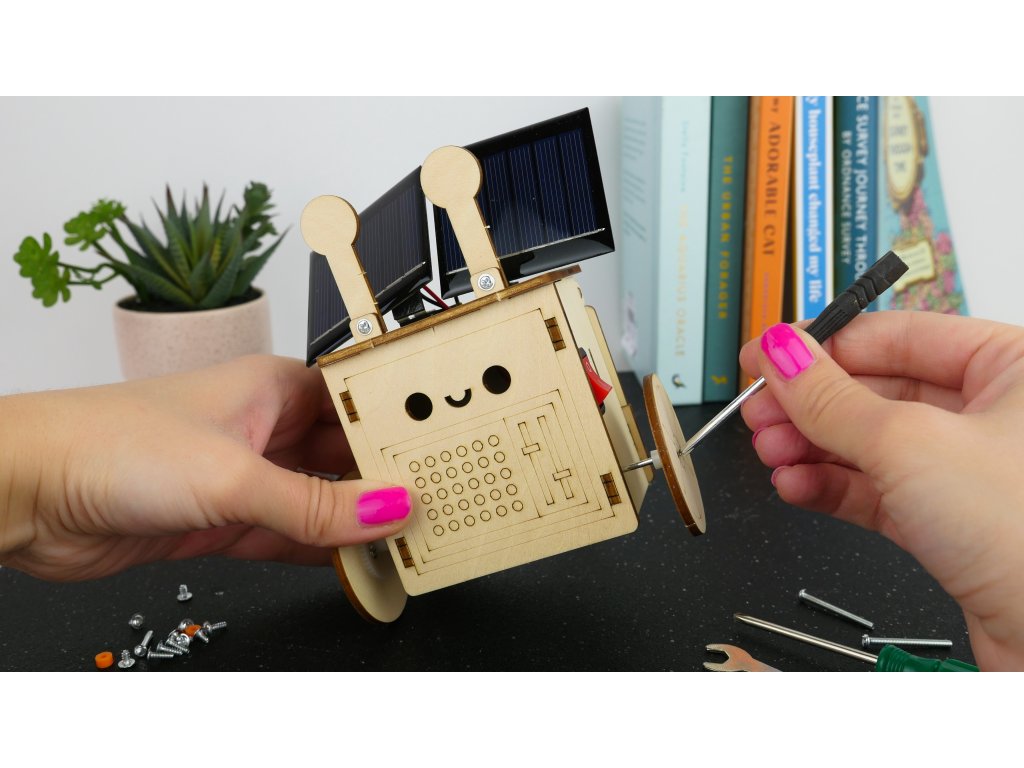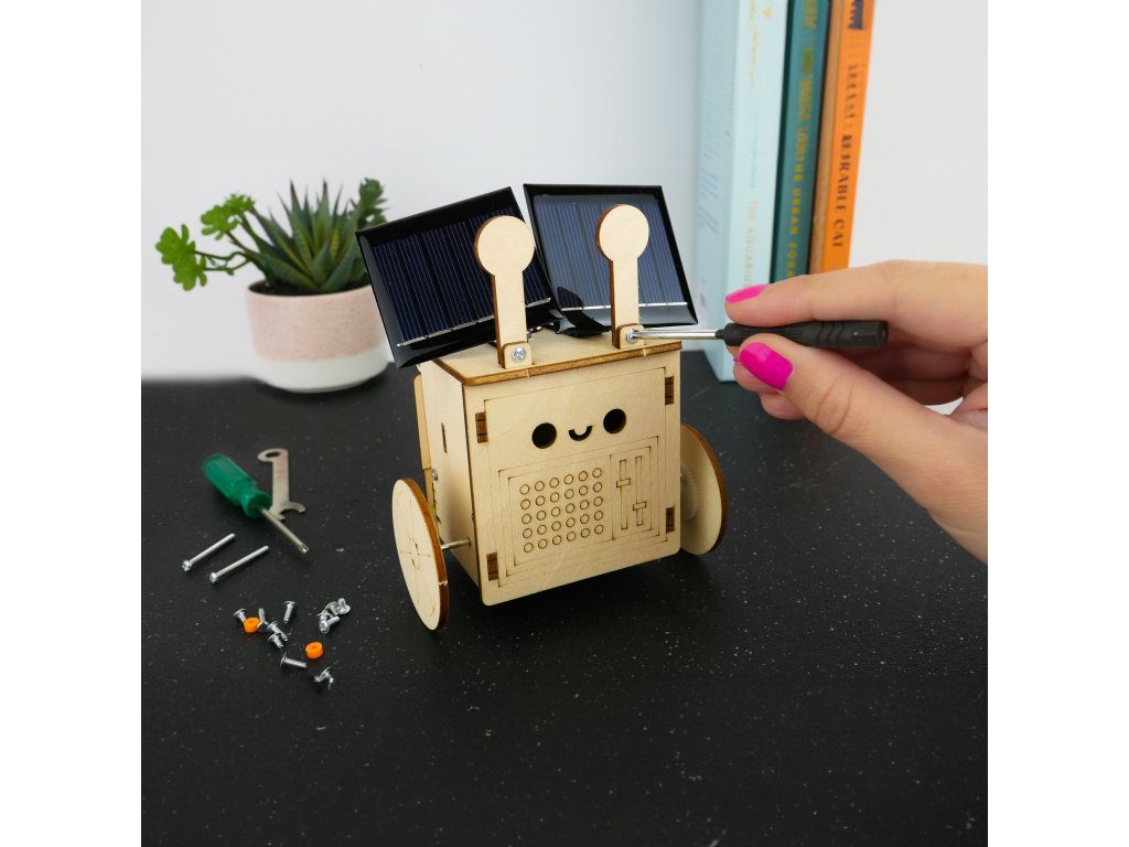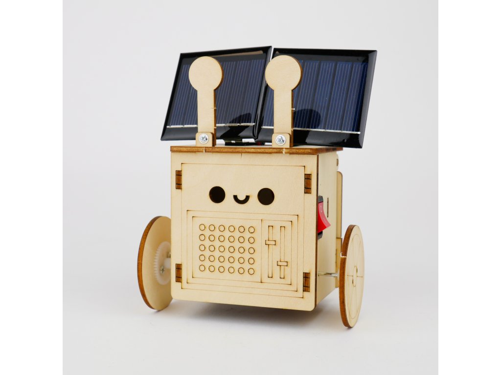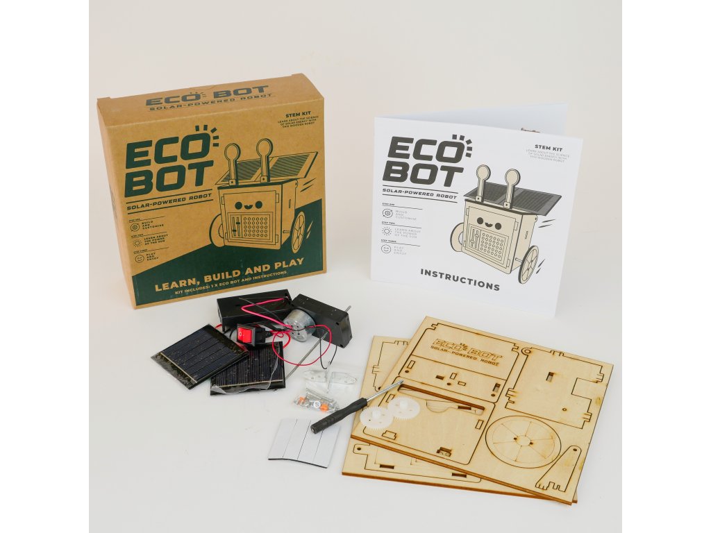 ECO BOT - SOLAR-POWERED ROBOT Description: Unleash your creativity with this eco-friendly wooden robot STEM kit. Embrace sustainability as you construct this solar-powered racing marvel. Dims:16x17x5.5cm Product Info: 2x wooden Eco Bot sheets, 2x glue sheets, 1x screwdriver, 2x solar panels, 2x solar panel brackets, 2x gears, 1x battery casing, 1x battery switch, 1x motor with wheel axle, 1x small wheel shaft, 1x small wheel shaft sleeve, long screws, short screws and screw nuts.Doplňkové parametry