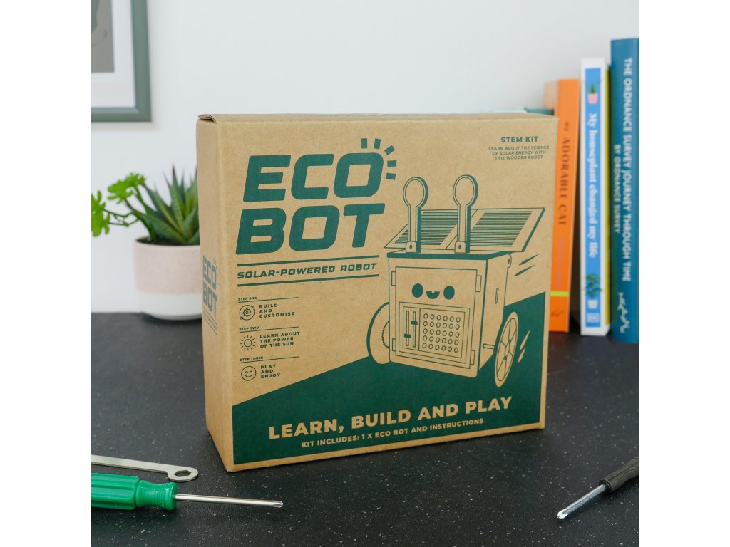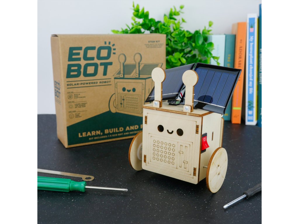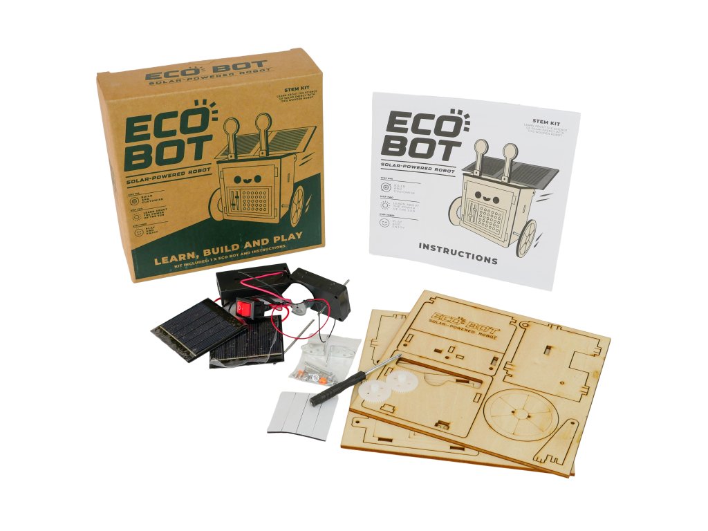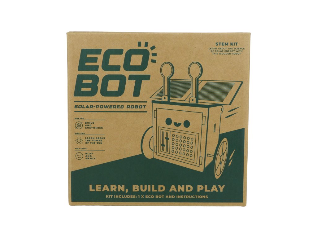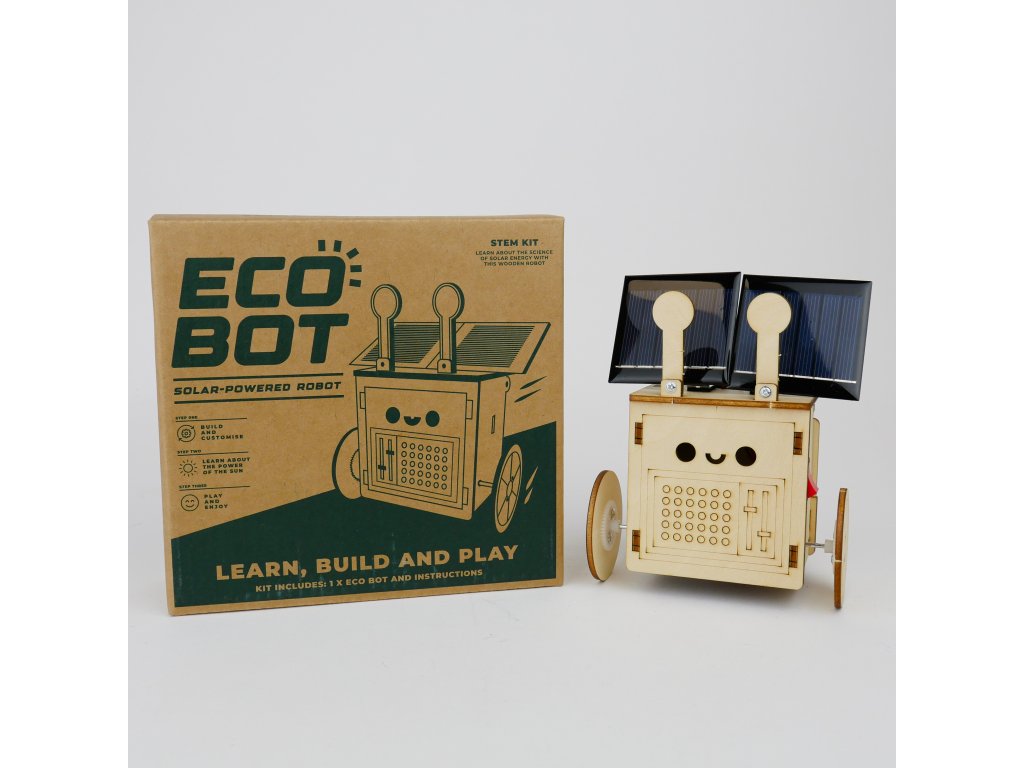 ECO BOT - SOLAR-POWERED ROBOT Description: Unleash your creativity with this eco-friendly wooden robot STEM kit. Embrace sustainability as you construct this solar-powered racing marvel. Dims:16x17x5.5cm Product Info: 2x wooden Eco Bot sheets, 2x glue sheets, 1x screwdriver, 2x solar panels, 2x solar panel brackets, 2x gears, 1x battery casing, 1x battery switch, 1x motor with wheel axle, 1x small wheel shaft, 1x small wheel shaft sleeve, long screws, short screws and screw nuts.Doplňkové parametry