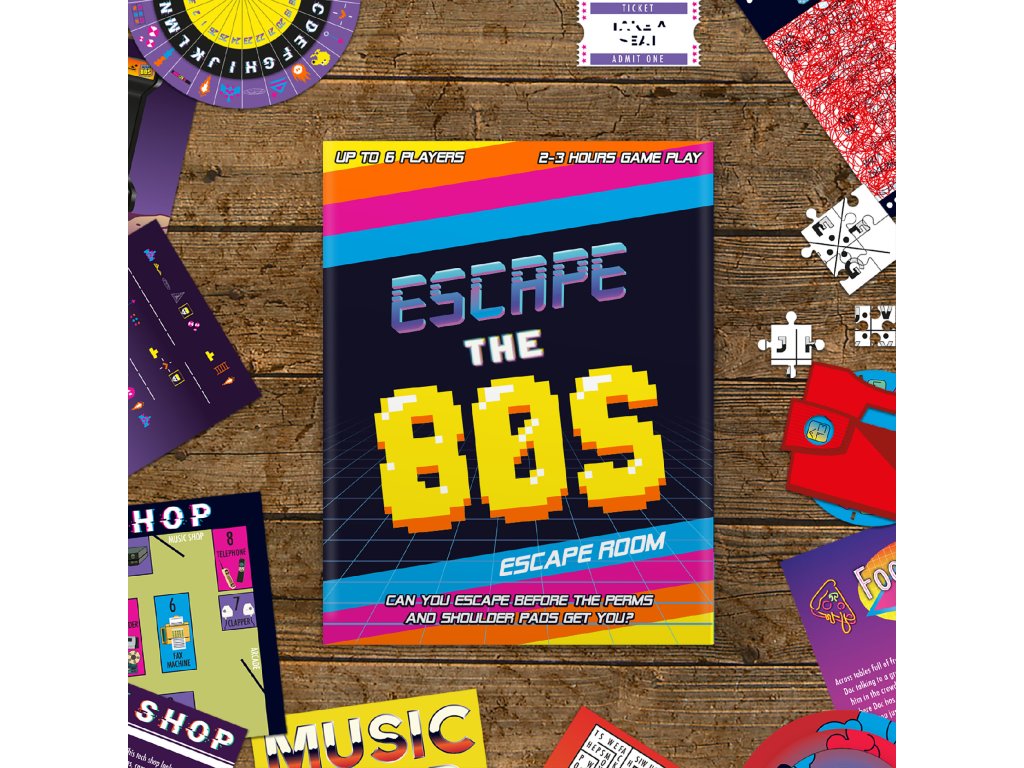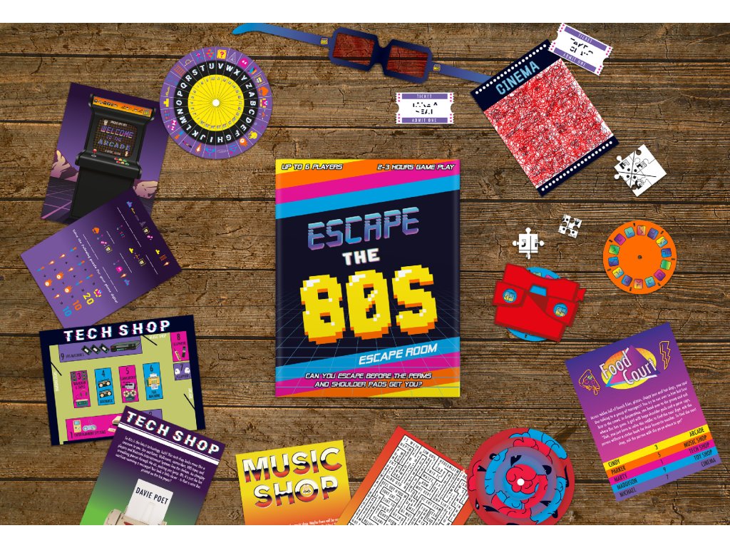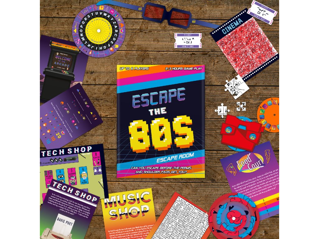 _ Description: When an 80s throwback party goes wrong and you end up stuck in the 80s, will you have the skills to escape? Grab your legwarmers and shoulder pads and create your own at-home escape room! Answer puzzles and riddles to get back to the present. Dims: 24x19x6cm Product Info: host's instructions booklet, 6 puzzles, 3 x Sudoku puzzles, 1 x Ultimate Toy Catalogue, 1 x fake tower of VHS tapes, 1 x videotape puzzle sheet, 1 x vinyl spinner, 1 x red glasses, 1 x movie quote puzzle, hints and answers booklet, 1 x time sheet, 1 x final stage telephoneDoplňkové parametry