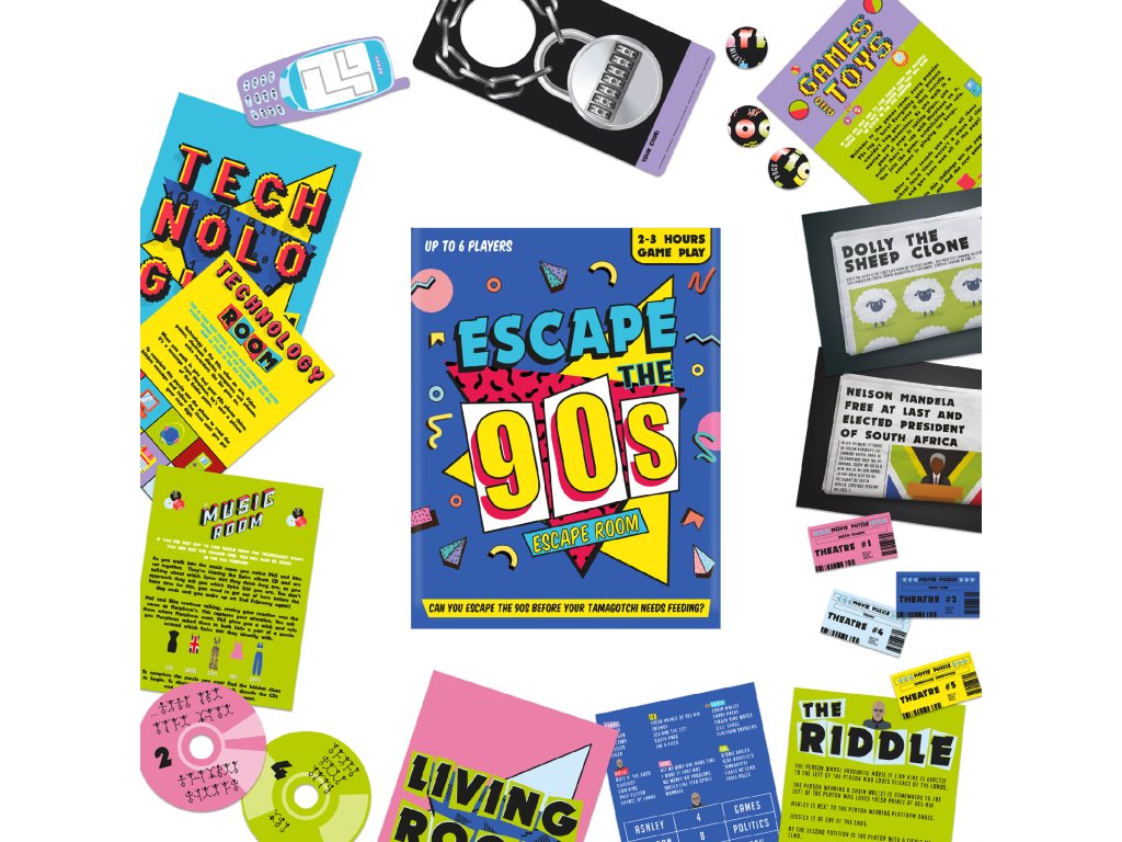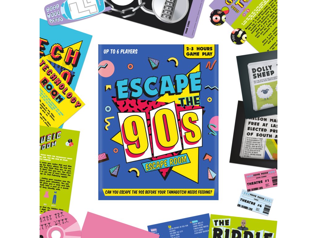 _ Description: You’re stuck in the 90s! You repeat the same day over and over, hearing the same 90s music and movie references. Do you have the skills to escape and get back to the present? Grab your plaid skirt and your platform shoes, it’s time to make an at home escape room! Dims: 24x19x6cm Product Info: host’s instruction booklet, 2 x paper pills, 6 x puzzles, 1 x bright light art board box, 1 x paper cut out sheet, 1 x cassette tape box, 1 x ginger spice tube, 1 x voice recorder, 1 x computer, hints and answers booklet, 1 x time sheet, 1 x final stage door codeDoplňkové parametry