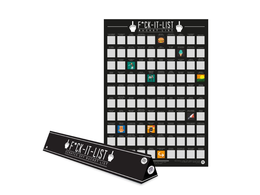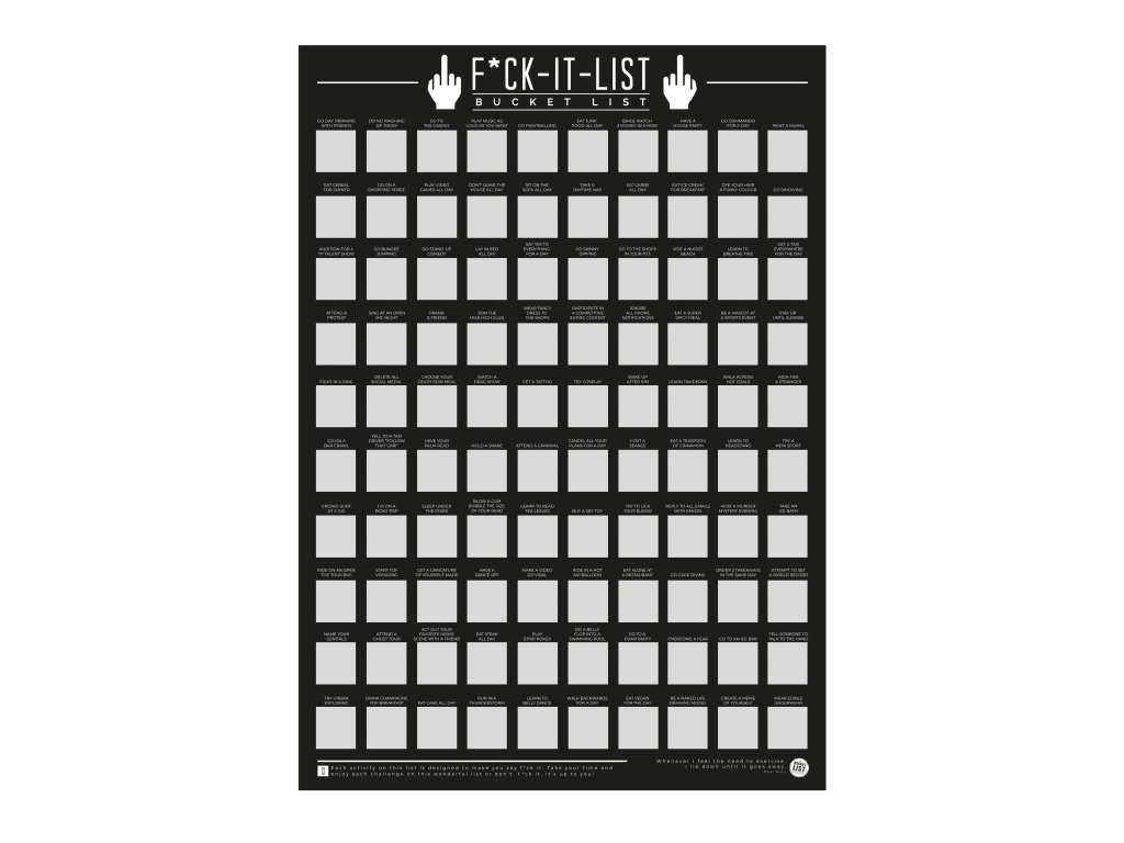 F*ck-it-list scratch poster Description: Do you ever just want to say f*ck it? Well this list is designed to help you let loose and do precisely that. From ditching that salad, you were meant to eat for some fried chicken, to heading down the casino with your best friends to win big. Dims: 46x8.5x8cm Product Info: scratch posterDoplňkové parametry