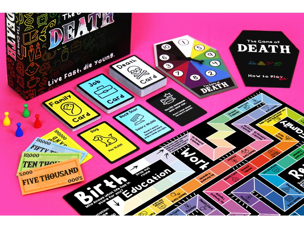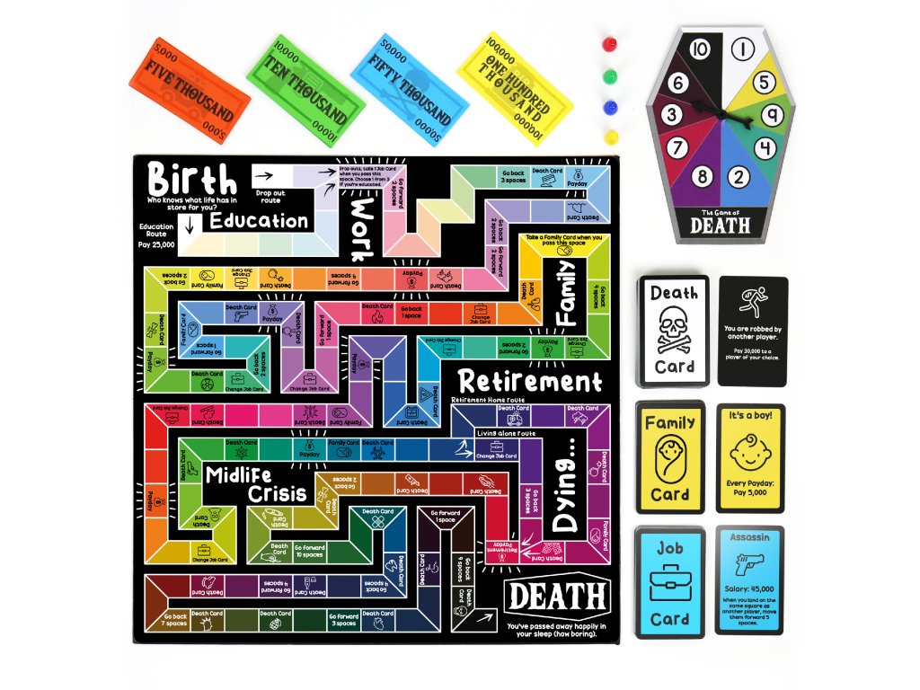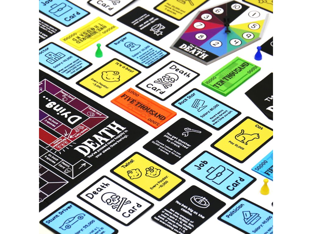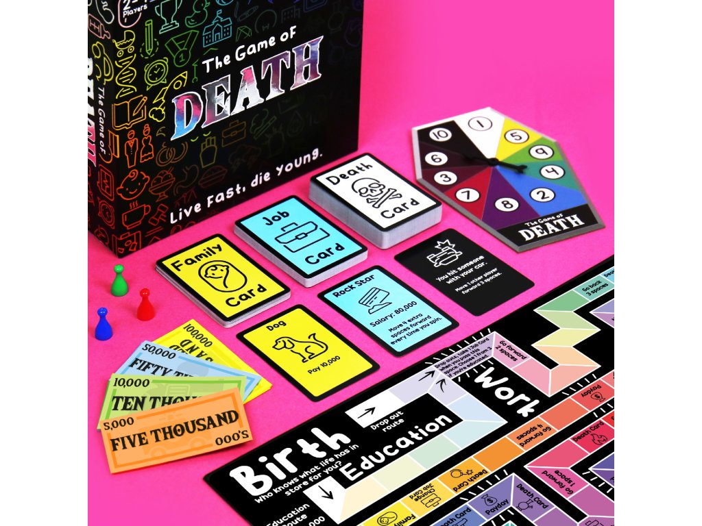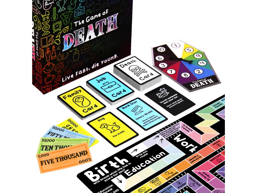 The Game of Death Description: Live fast and Die young is the motto of this game. Players race along the board obtaining jobs, families (and sometimes herpes), just make sure you don’t reach the end of the board or run out of money whilst living life in the fast lane or it’s game over! Dims: 24.6 x 24.6 x 6.7 cm Product Info: 110 cards, 100 bank notes, 4 game pieces, 1 spinner, 1x game board, 1x instruction bookletDoplňkové parametry
