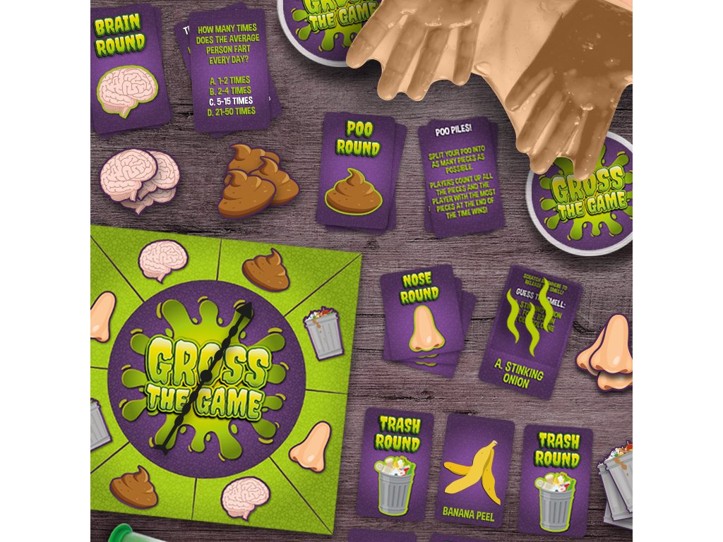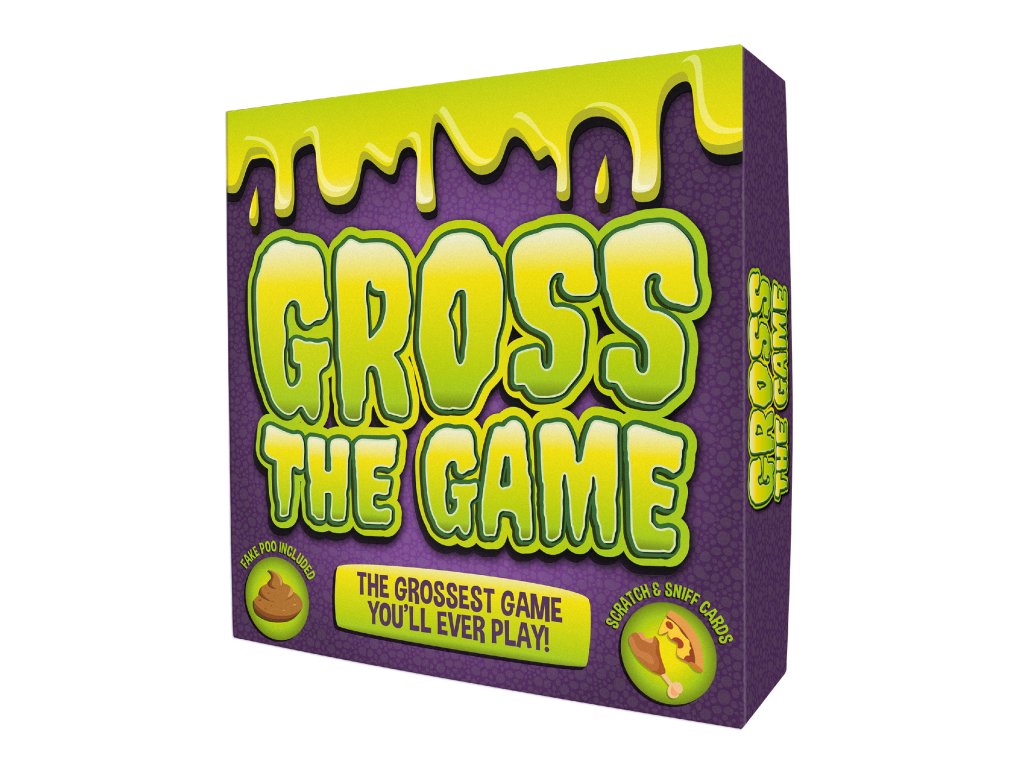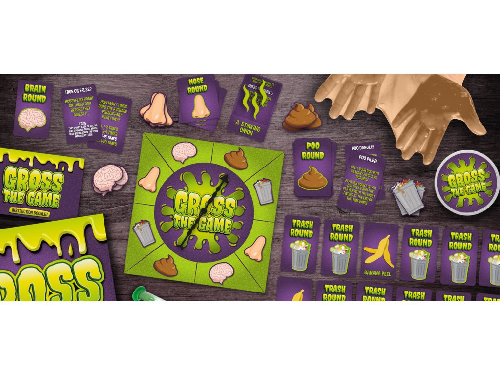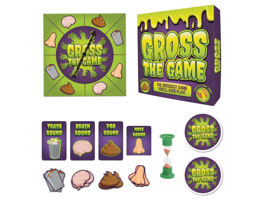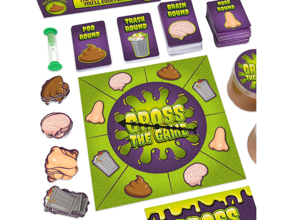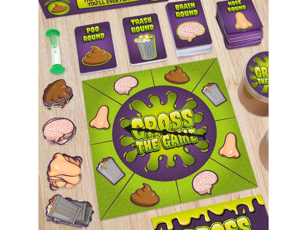 _ Description: Do you love all things gross? This family friendly board game pushes players to their limits with fake poo, memory, trivia and scratch and sniff rounds! The first player to collect all gross tokens is the winner and crowned the grossest person around! Do you think you have what it takes? Or will this game make you scream “EWW GROSS!” Dims: 24.5x24.5x7cm Product Info: 40x round tokens, 2x fake poos, 1x spinner, 1x sand timer, 100 cards and 40 scratch and sniff cards.Doplňkové parametry