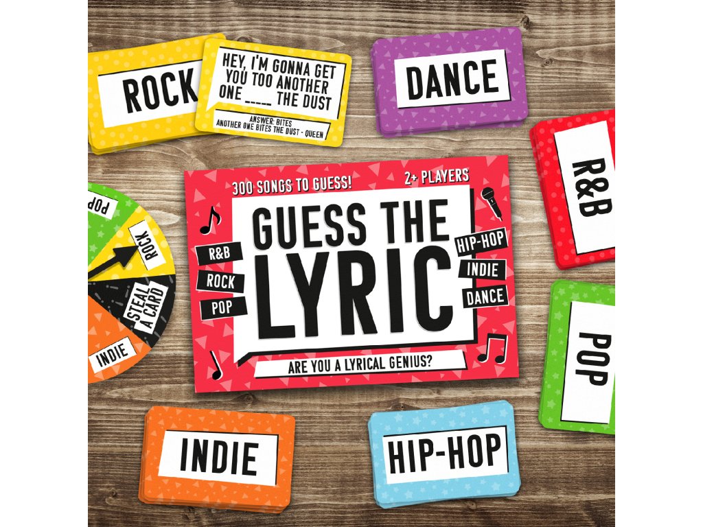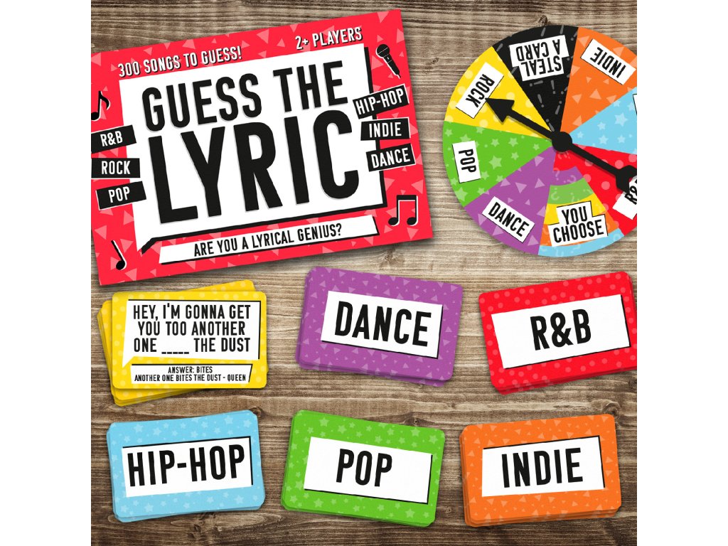 Guess the Lyric Do you know someone who always singing along to radio but gets the lyrics wrong? Put them to the test with 300 of the most iconic songs to find out if they really are a lyric genius! The winner is the first player to correctly guess a missing lyric from each of the music genres. 17.5x11.5x7cm 300 cards and 1x SpinnerDoplňkové parametry