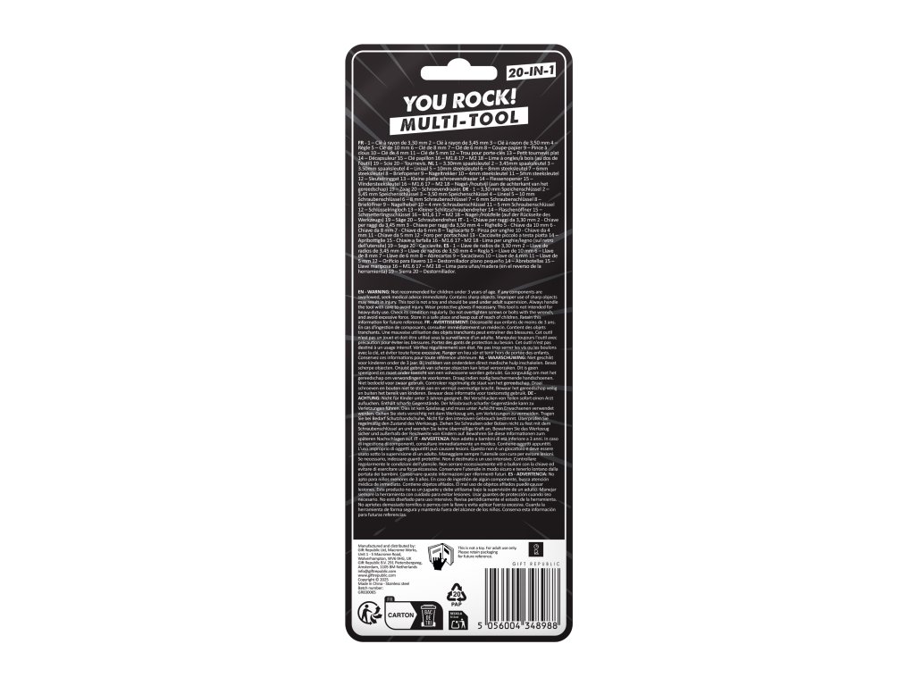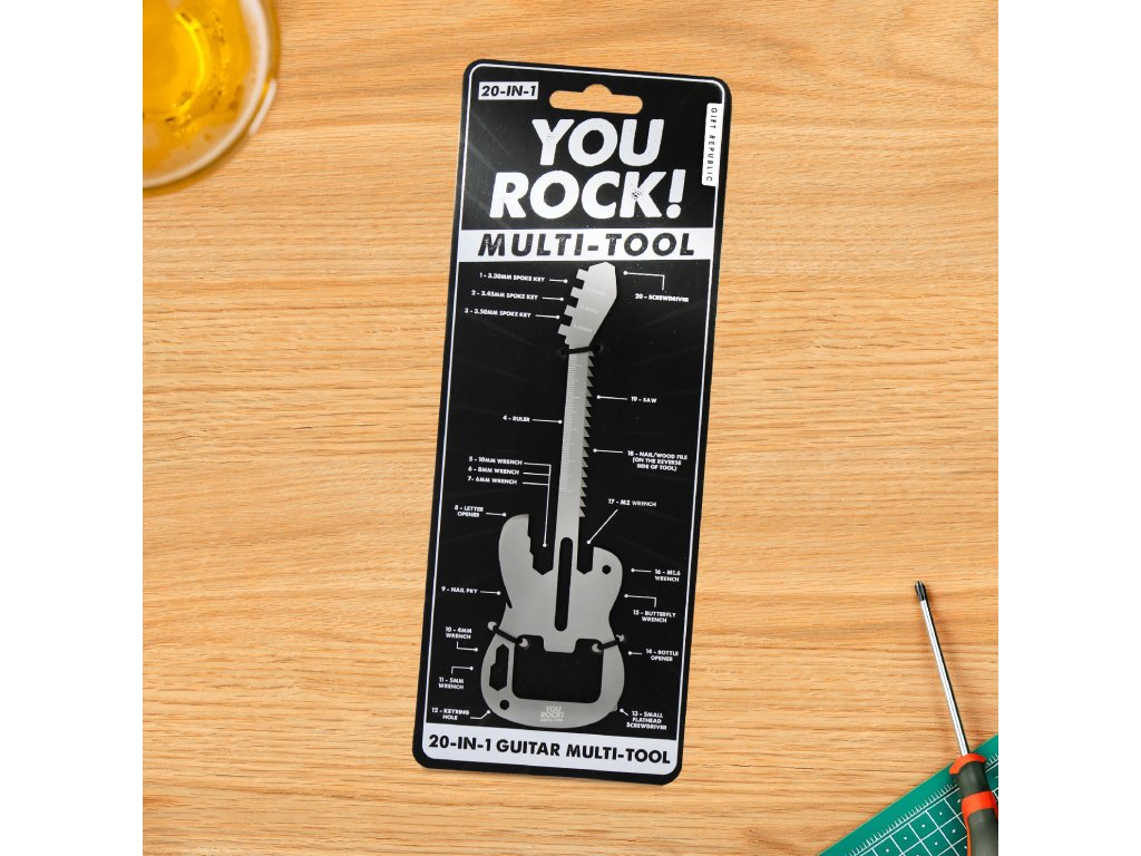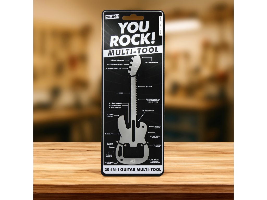 You Rock Multi-tool Description: Rock out with practicality using the You Rock Guitar Multi-Tool! This versatile tool combines style with function, featuring essential tools like a screwdriver, bottle opener, and more. Perfect for musicians and handy people alike, it’s a striking way to stay prepared for any situation while showcasing your love for music. Dims: 9.5x25cm Product Info: METAL MULTI-TOOL - INCLUDES 20 TOOLSDoplňkové parametry