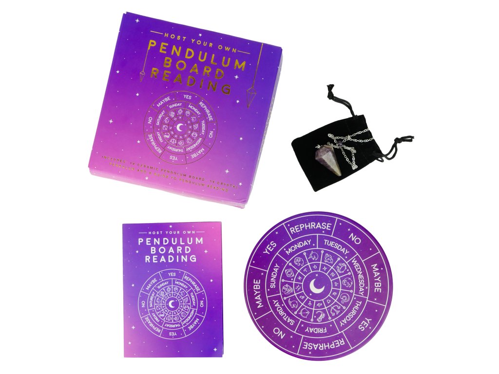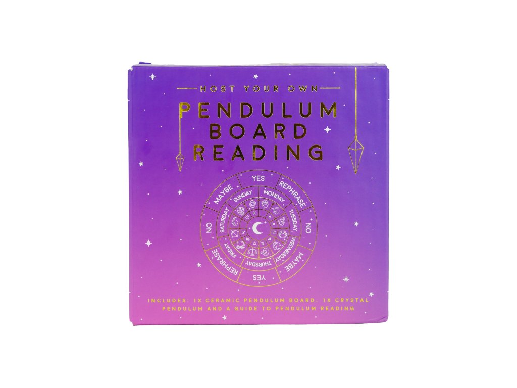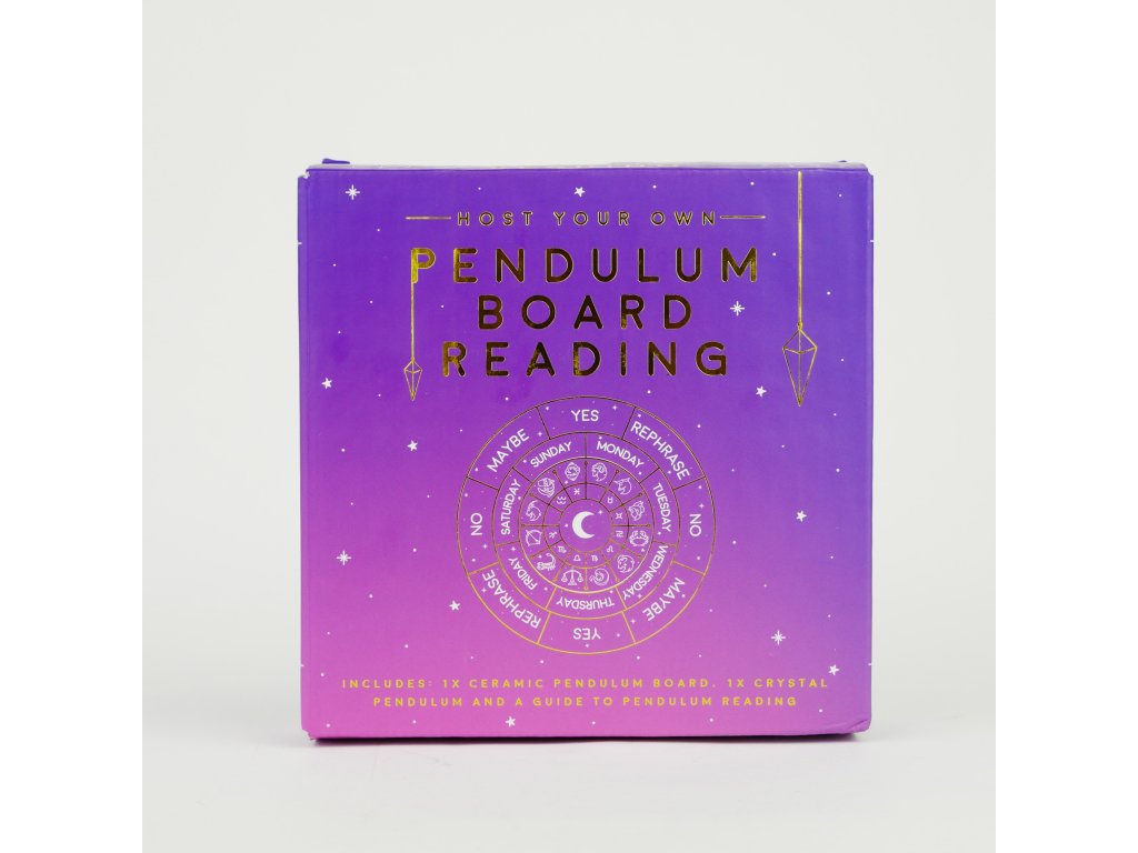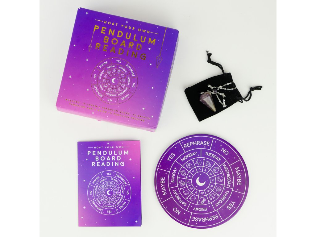 Product name: Host your own pendulum board reading Blurb: Unlock profound insights and guidance about the future with this pendulum board kit. Experience the power of the pendulum, as it guides you around the board to reveal the answers to your burning questions. Dims: 14 x 14 x 4cm Product Info: 1x pendulum board, 1x crystal pendulum, 1x velvet bag and 1x instruction bookletDoplňkové parametry