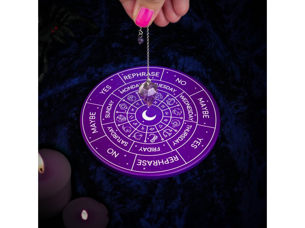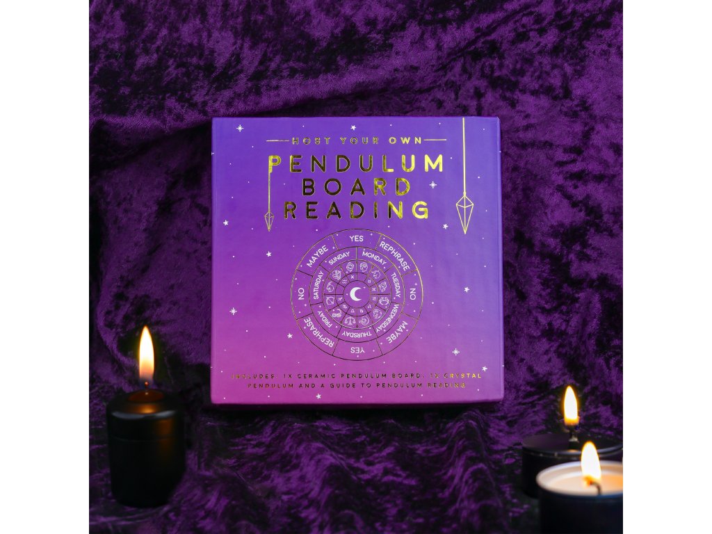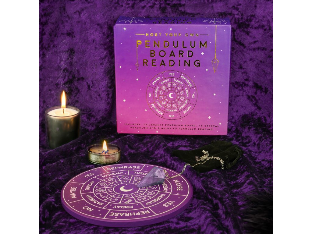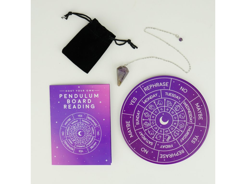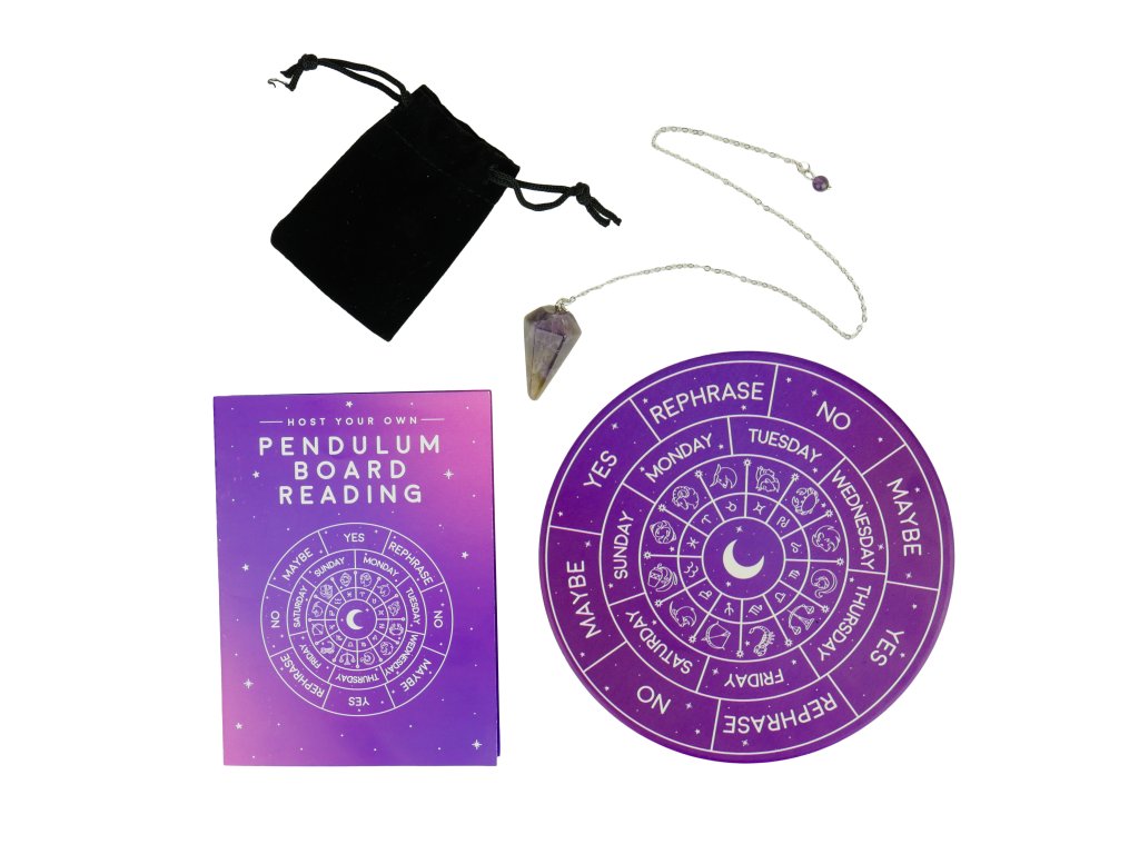 Product name: Host your own pendulum board reading Blurb: Unlock profound insights and guidance about the future with this pendulum board kit. Experience the power of the pendulum, as it guides you around the board to reveal the answers to your burning questions. Dims: 14 x 14 x 4cm Product Info: 1x pendulum board, 1x crystal pendulum, 1x velvet bag and 1x instruction bookletDoplňkové parametry