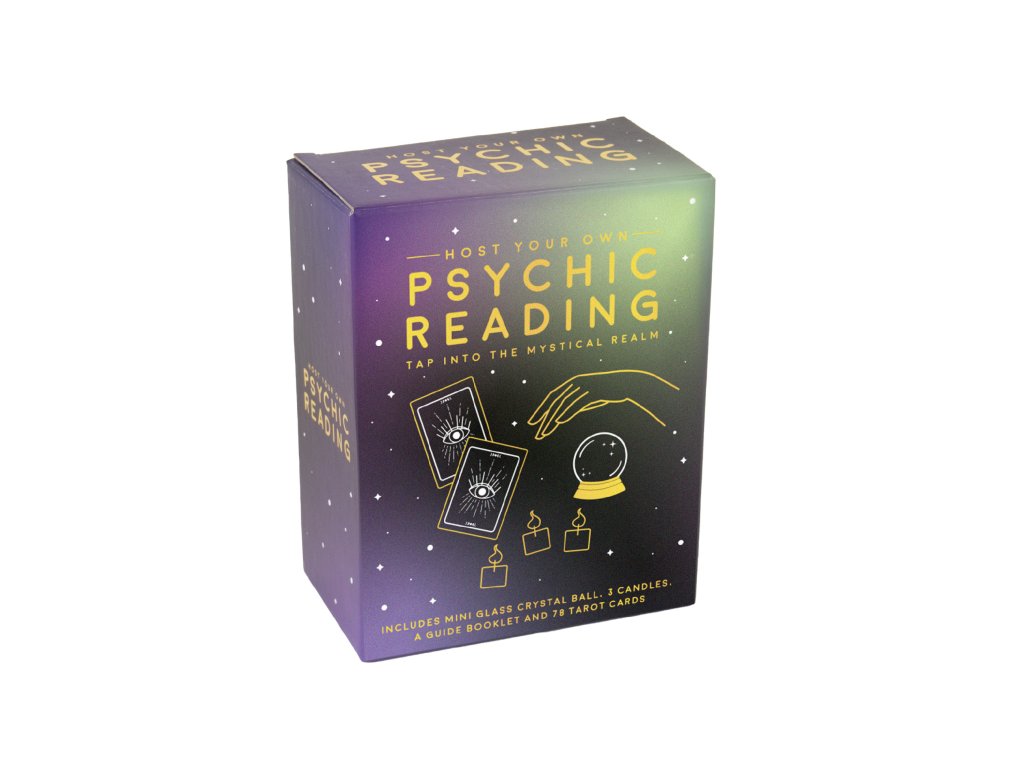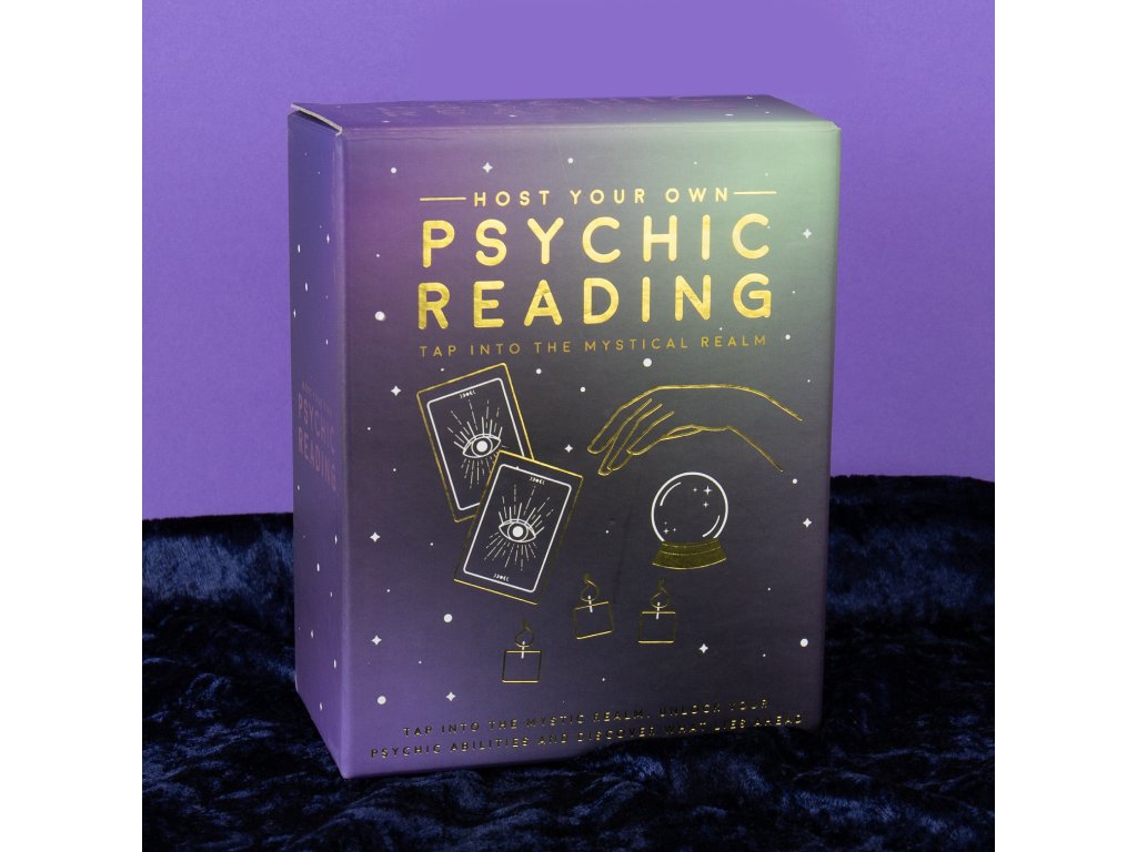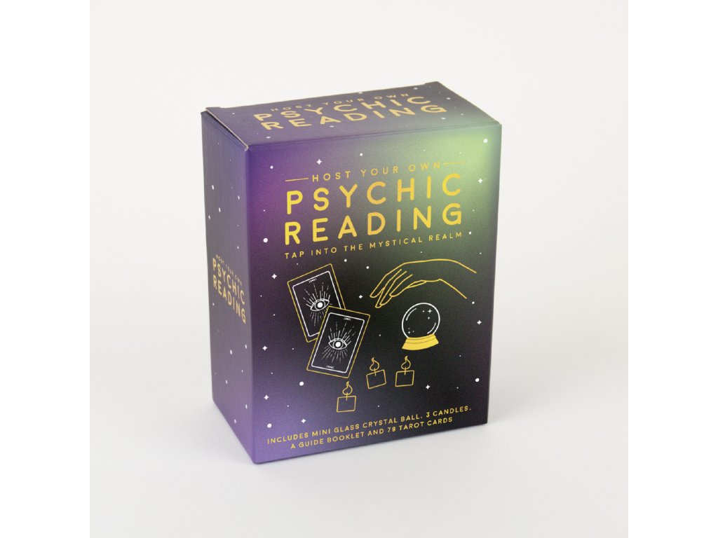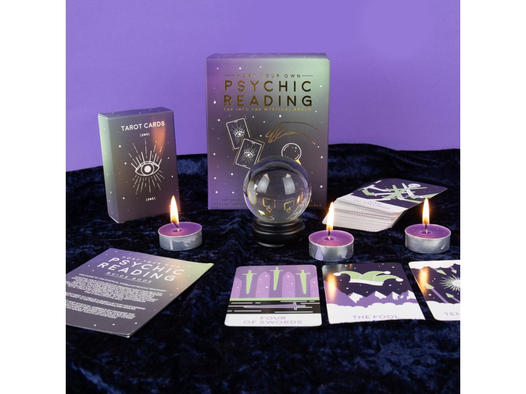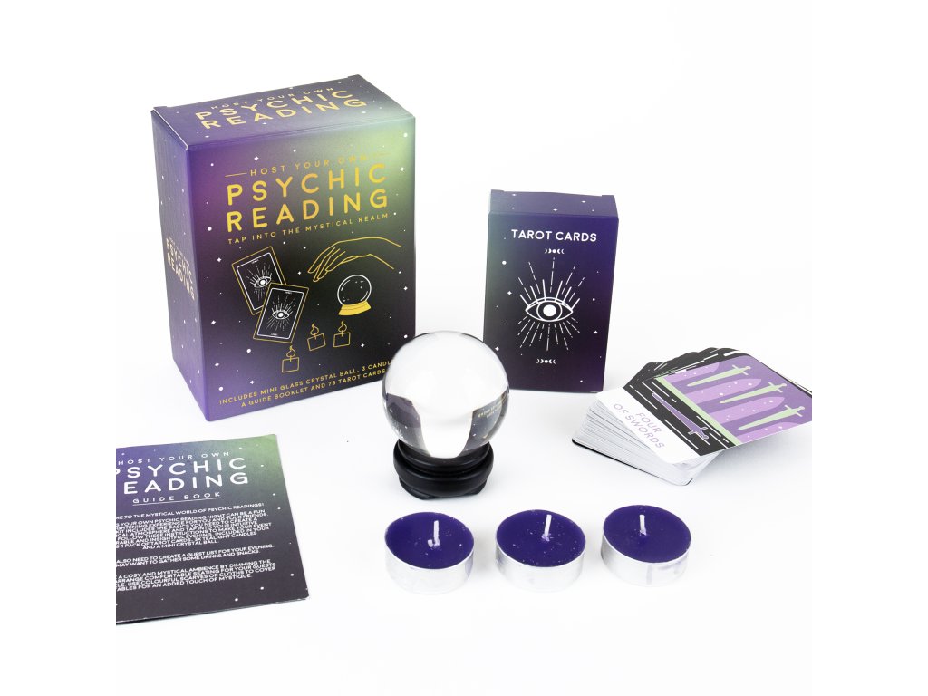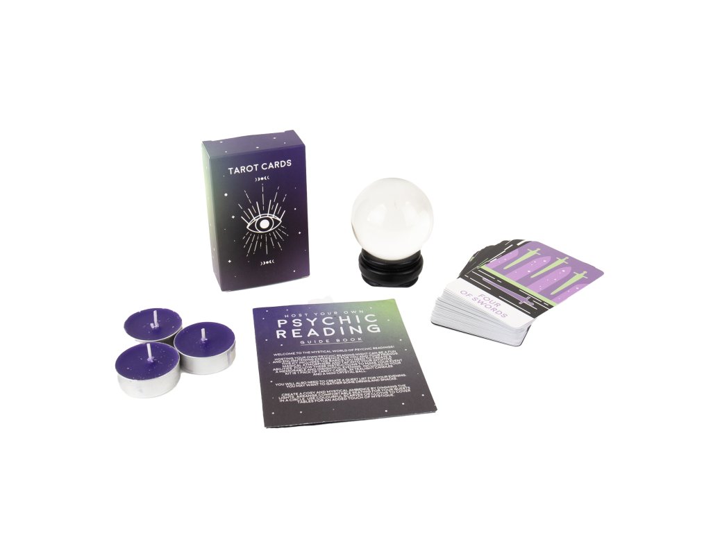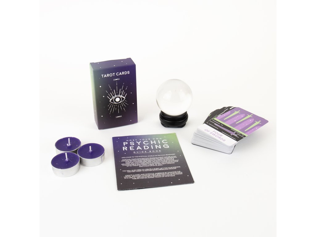 Host Your Own Psychic Reading Night Description: Are you ready to tap into the mystical realm and uncover the secrets of your future? This kit is your gateway to a world of enlightenment, divination and self-discovery. Dims: 15x11.7x7cm Product Info: 1x mini glass crystal ball, 1x guide booklet, 3x mini lavender scented candles and a pack of tarot cards.Doplňkové parametry