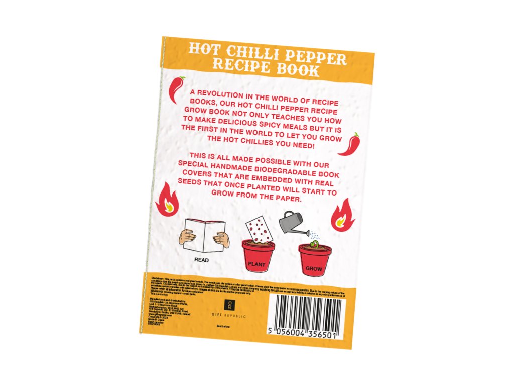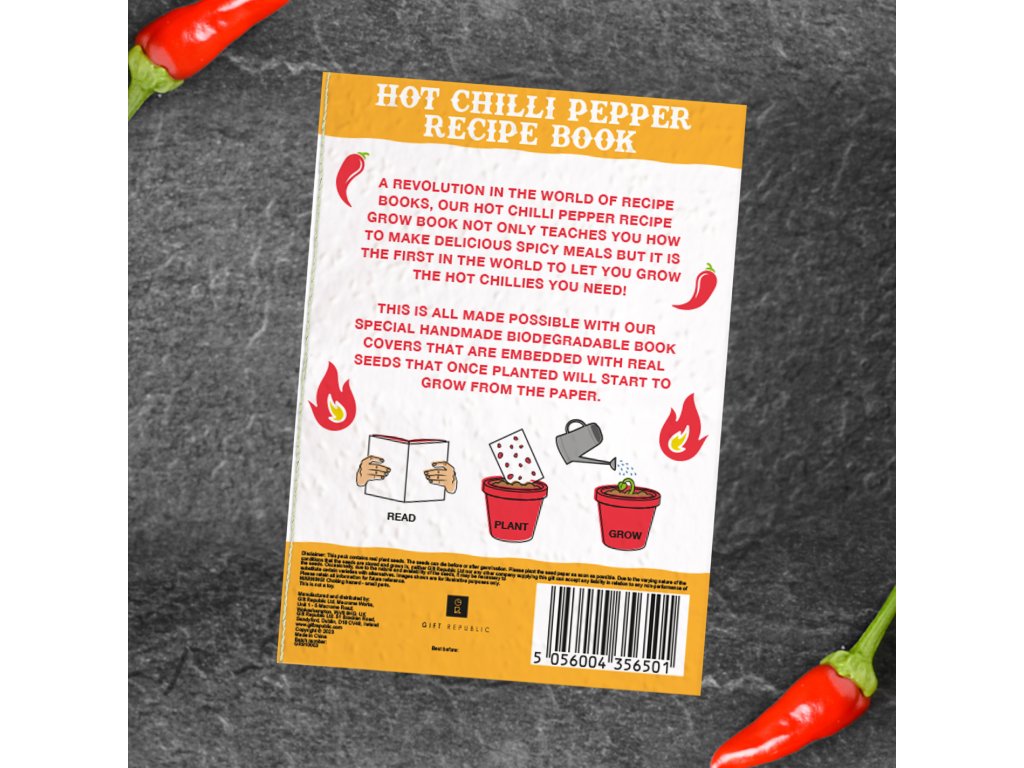 Hot Chilli Pepper – GROW BOOK Description: A revolution in the world of recipe books, our Hot Chilli Recipe Grow Book not only teaches you how to make delicious spicy meals but also lets you grow the hot chillies you need! This is all made possible with our special handmade biodegradable book covers which are embedded with real seeds that once planted will start to grow from the paper. Packaging: Plantable Book Covers Dims: 14.5x20cm Product Info: 14x Pages and 2x pages with Chilli Pepper SeedsDoplňkové parametry
