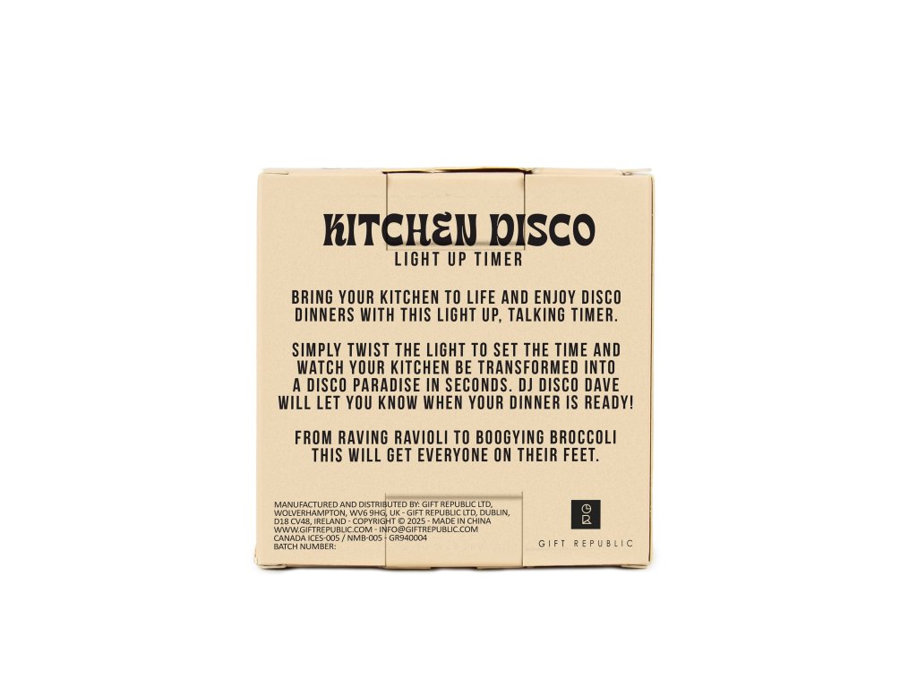 KITCHEN DISCO - LIGHT-UP TIMER Turn cooking into a party! This timer doubles as a funky disco light, adding flair to your kitchen countdowns. Set your desired time and watch the vibrant colours dance as you cook up a storm. 8.5cm x 7.9cm Info: Includes red, blue, green and yellow flashing lights.Doplňkové parametry