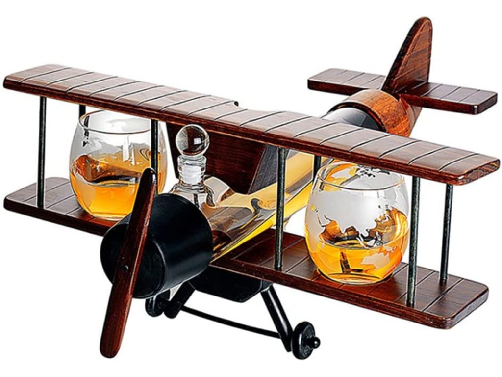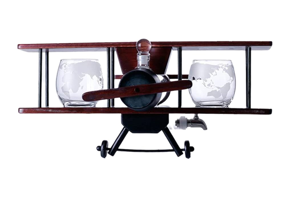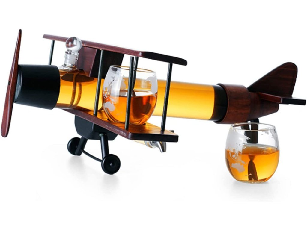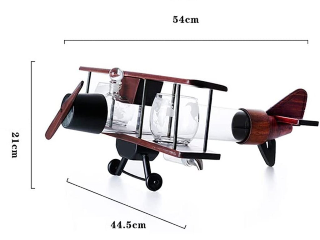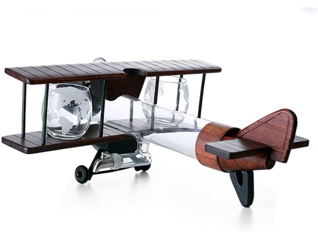 Přijměte svou lásku k cestování, dobrodružství a dobré whisky/scotch. Tento krásně stavěný model letadla s foukanou karafou a 2 sklenicemi do letadla musíte mít. Karafa Letadlo s gravírovanými sklenicemi připomíná staré časy a dřevěná základna má jantarový odstín, což z něj dělá krásný domácí kousek. Nasazená skleněná zátka utěsňuje karafu pro ideální skladování a udržuje váš oblíbený nápoj chutný a aromatický. Darujte ho milované osobě, příteli, příbuznému, nebo pokud máte chuť, dopřejte si ho! Ideální jako dárek pro vaše partnery, rodiny a přátele během svátků a jiných slavnostních okamžiků, tento elegantní karafa propůjčí vašemu barovému stolu auru sofistikovanosti a dobrodružství. Toto jedinečné a elegantní skleněné nádobí je perfektním dárkem na Vánoce, Nový rok, Valentýna, Den otců, svatby, mládenci, výročí, večírky, narozeniny, kolaudace a další.