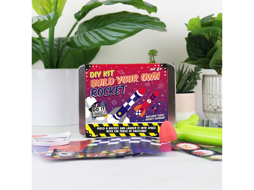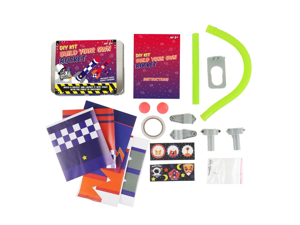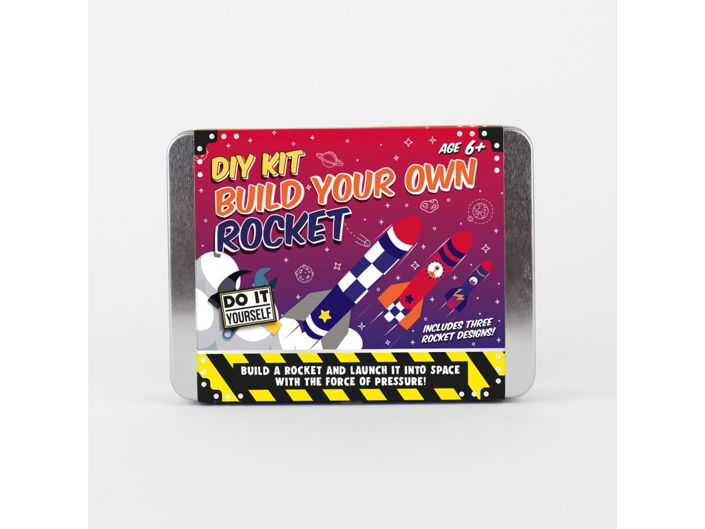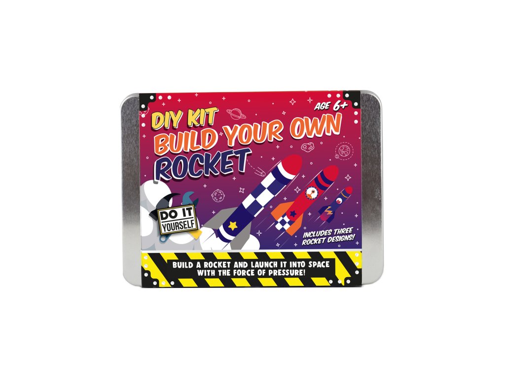 DIY Build Your Own Rocket Kit Description: Pop your science caps on and get ready to create awe-inspiring rocket launches! This kit is here to help you achieve this mission with minimal setup with the use of two recycled plastic bottles. Packaging: Tin with cardboard wrap Dims: 11x16x3.5cm Product Info: 3 x rocket sheet designs, 9x rocket fins, 2x foam rocket heads, 2x sheets of stickers, double-sided tape, launching stand parts and 1x instruction booklet.Doplňkové parametry