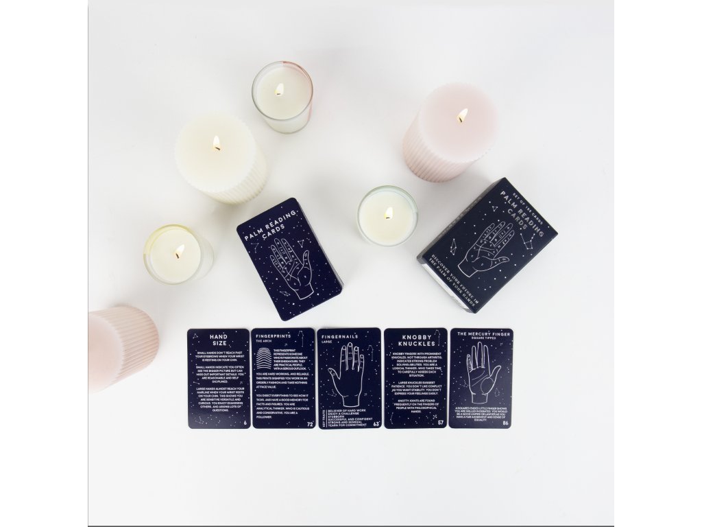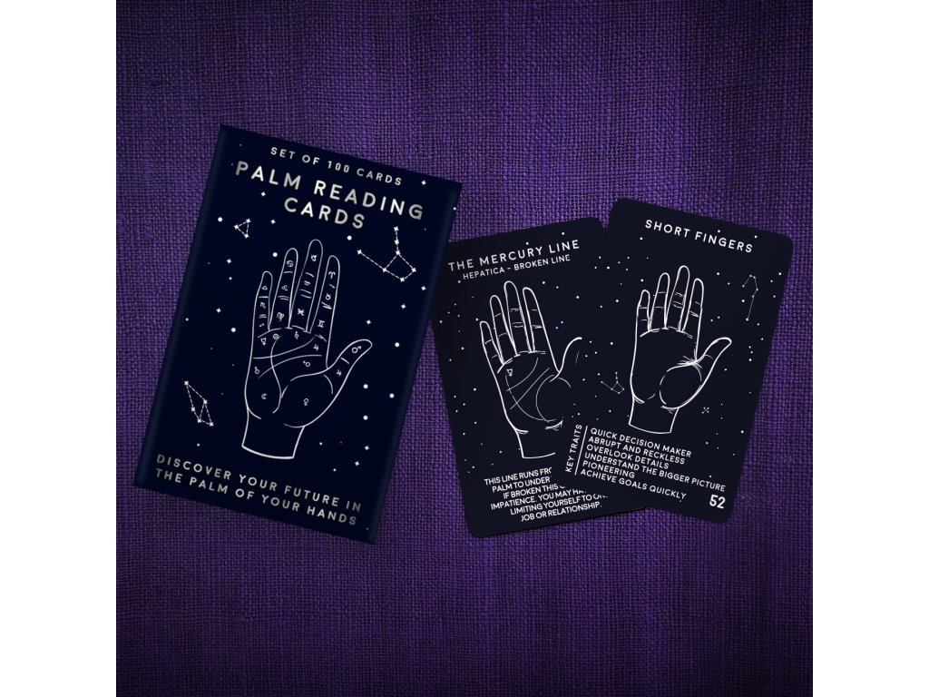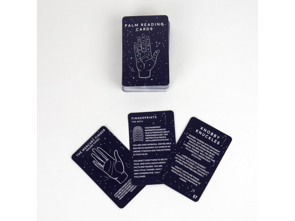 Palm Reading Cards Learn the essence of the ancient art of palm reading with this 100 card kit! Ideal for any fortune teller on the go.Doplňkové parametry
