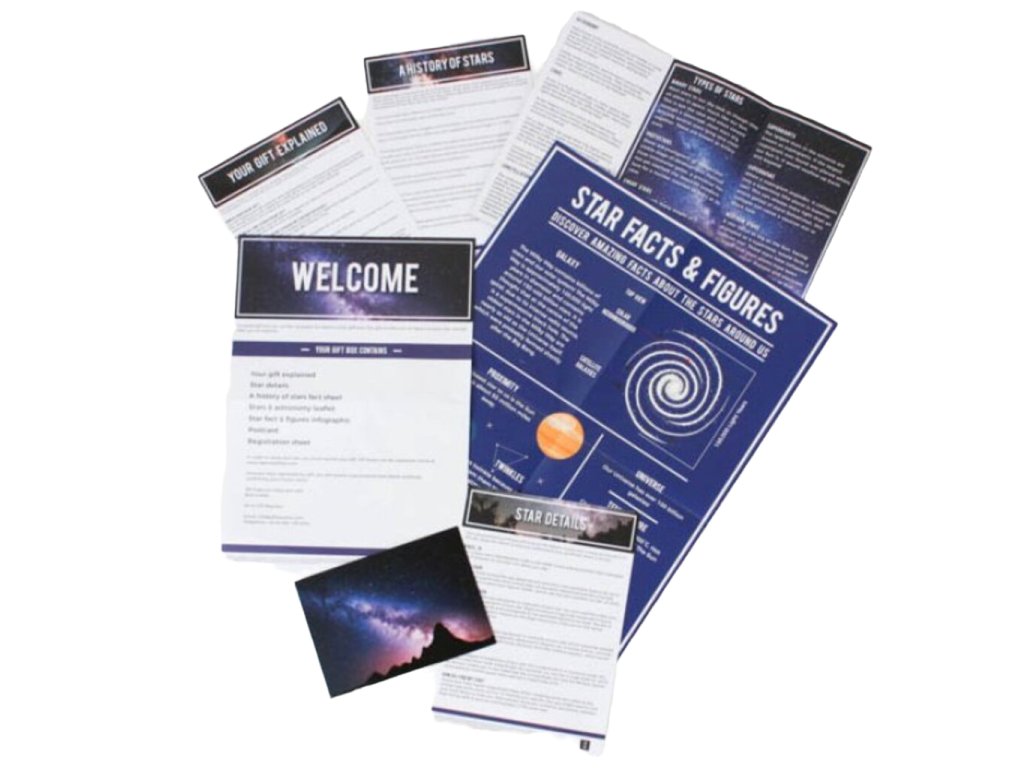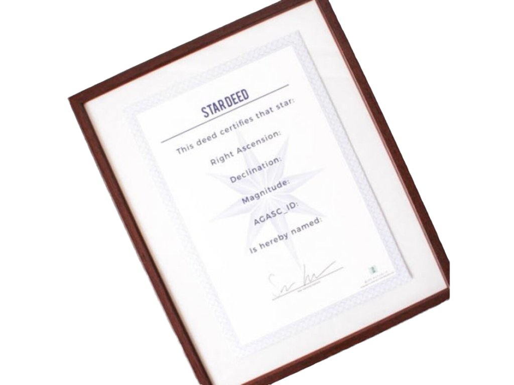 - Po online registraci obdržíte personalizovaný certifikát Star Deed (rámeček není součástí balení).