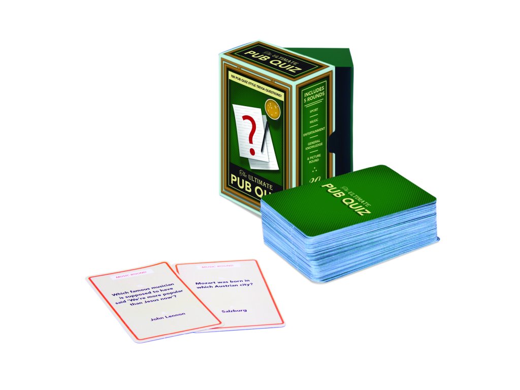 Test your quiz knowledge with The Ultimate Pub Quiz trivia box. The trivia box contains 100 questions with 5 different rounds - Sport, Music, Entertainment, General Knowledge and a picture round. Why not grab your mates and see whos the best?