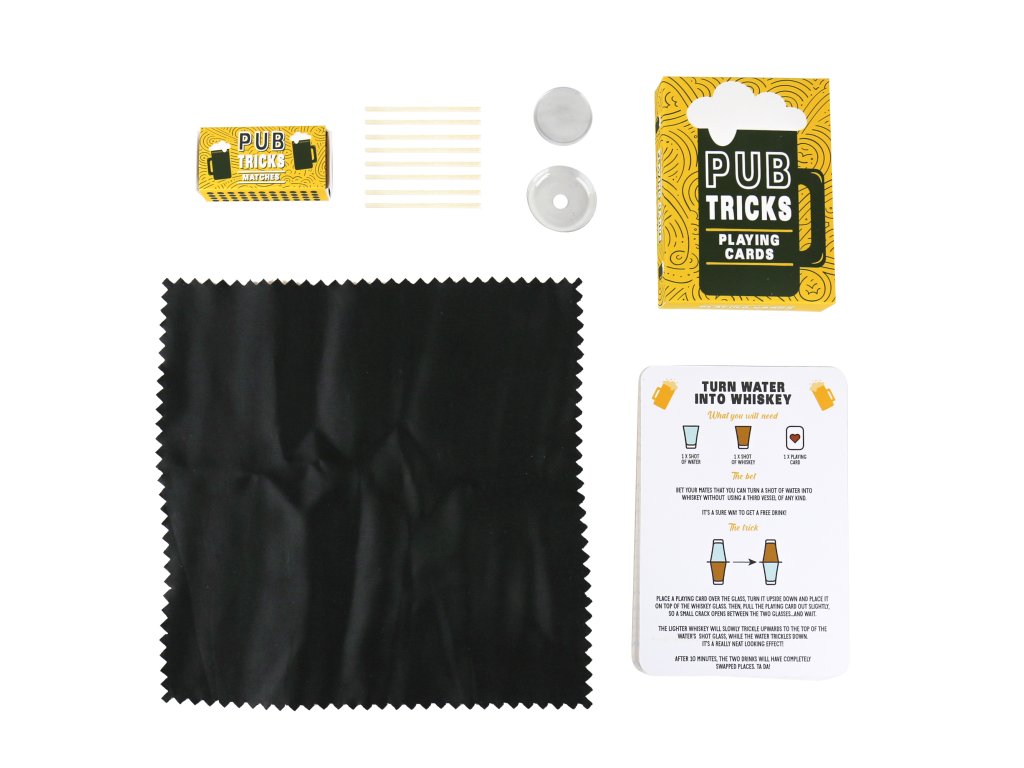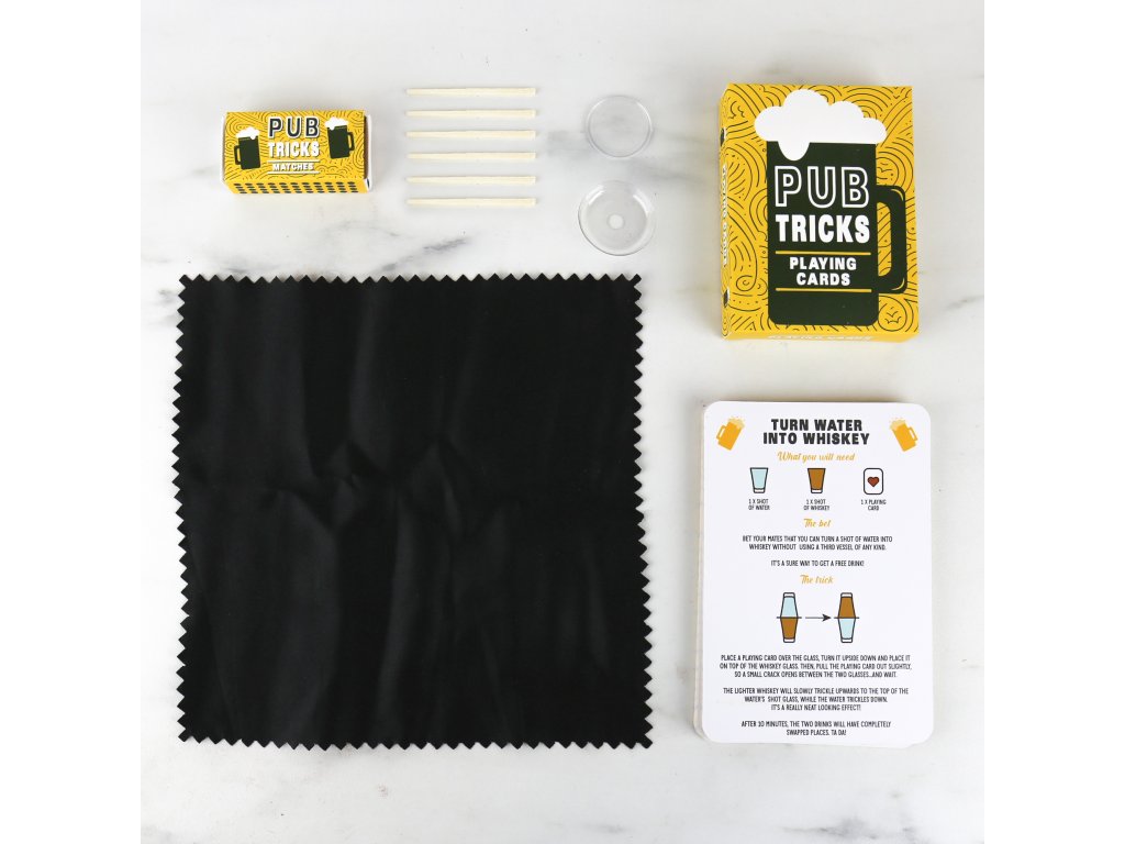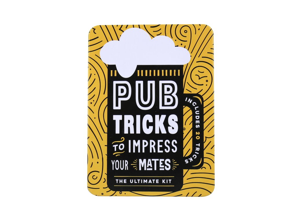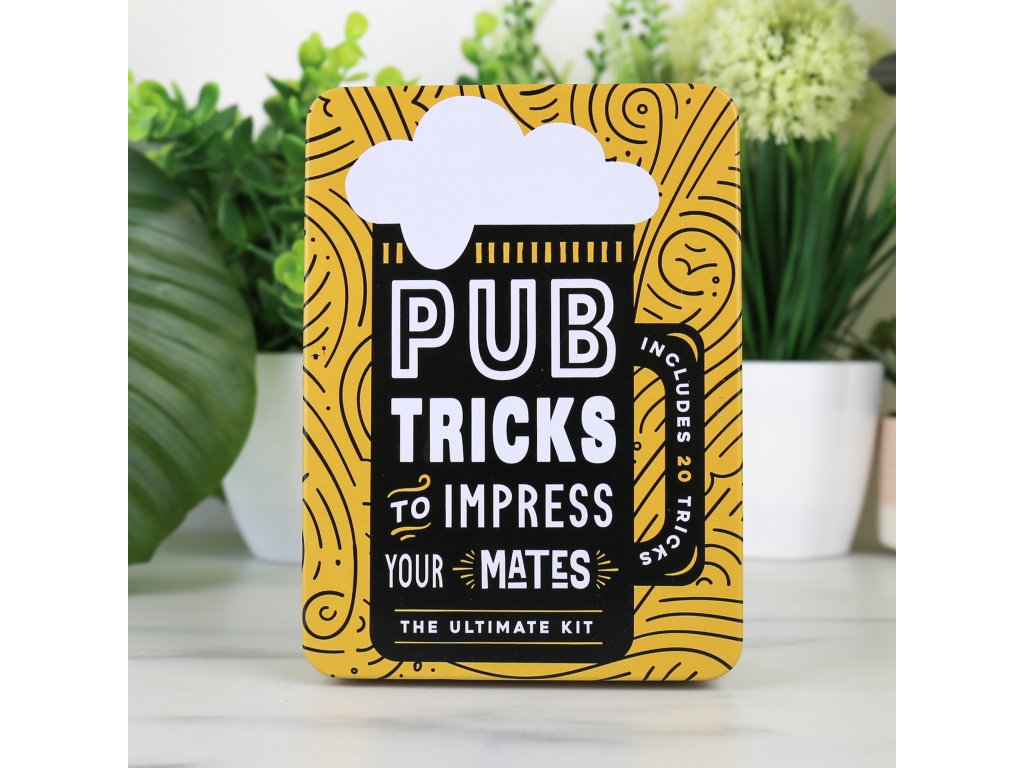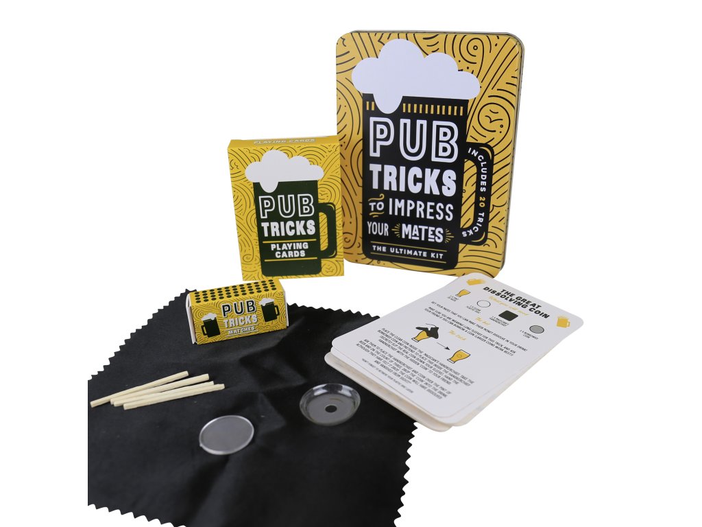 Pub Tricks Tin Description: Impress your friends and family next time you’re down the pub with these show-stopping tricks. If you play your cards right, you might even win a free drink or two. Dims:15.5x11.5x4cm Product Info: 20 pub trick cards, invisible bottle cap, matchbox, handkerchief, invisible coin and a deck of playing cards.Doplňkové parametry