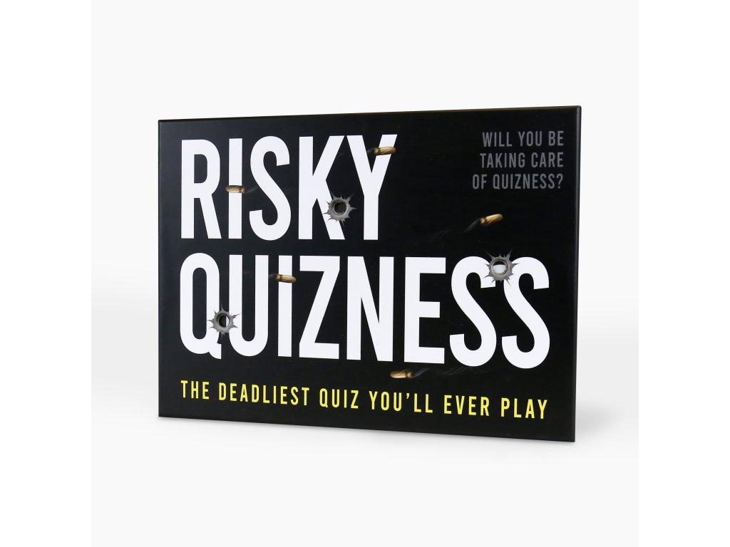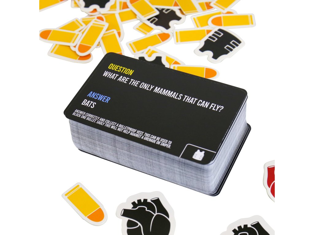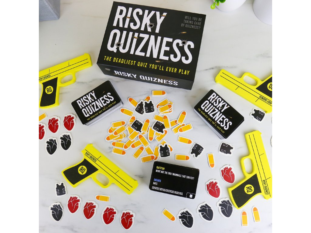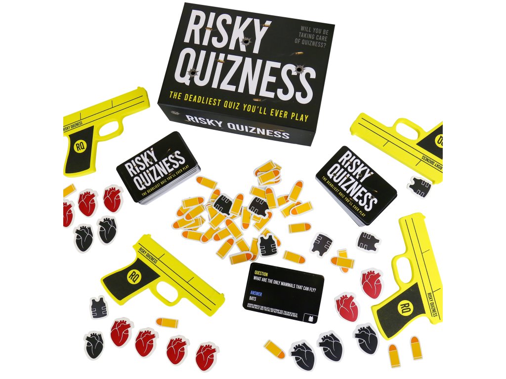 Risky Quizness Description: Will you be taking care of quizness, or will you be killed by one of your opponents in a gun slinging battle to be crowned the champion? This no holds barred quiz game will push your friendships and knowledge to the limits. Answer questions correctly to load your weapon as you shoot your way to success. Dims: 220x16x9cm Product Info: 300 question cards, 4 foam guns, life chips, ammo chips, bulletproof vest chips and instructions.Doplňkové parametry
