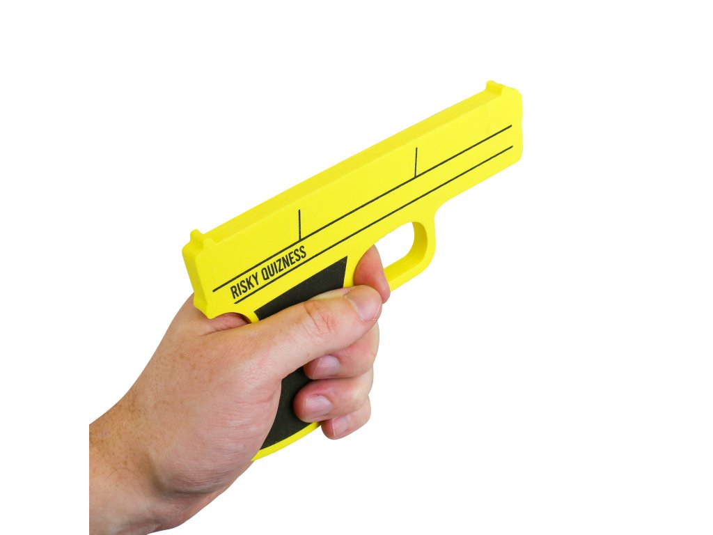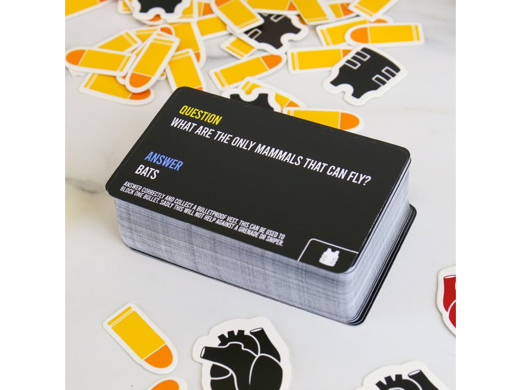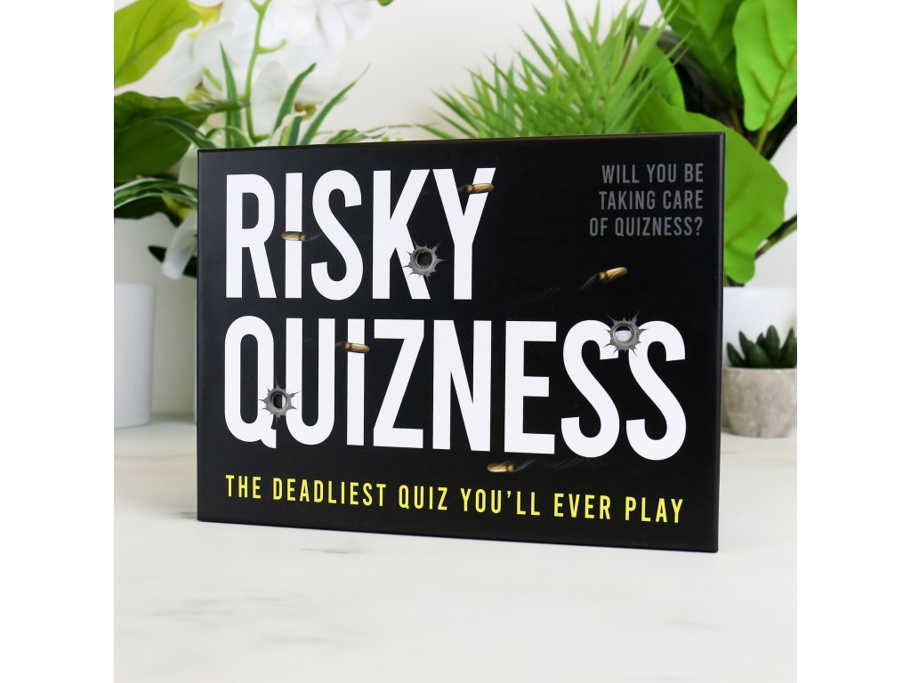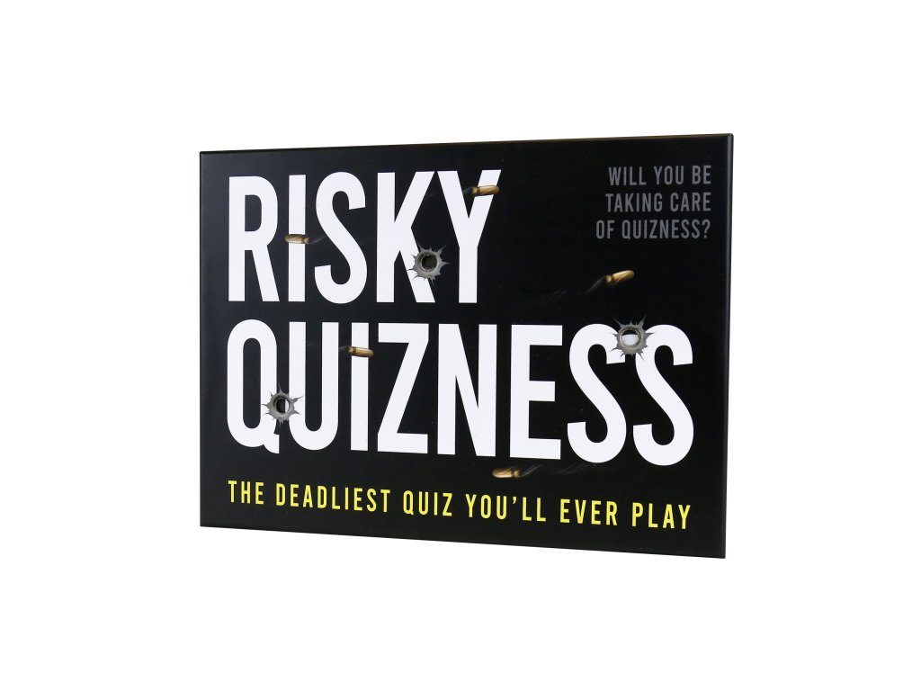Risky Quizness Description: Will you be taking care of quizness, or will you be killed by one of your opponents in a gun slinging battle to be crowned the champion? This no holds barred quiz game will push your friendships and knowledge to the limits. Answer questions correctly to load your weapon as you shoot your way to success. Dims: 220x16x9cm Product Info: 300 question cards, 4 foam guns, life chips, ammo chips, bulletproof vest chips and instructions.Doplňkové parametry