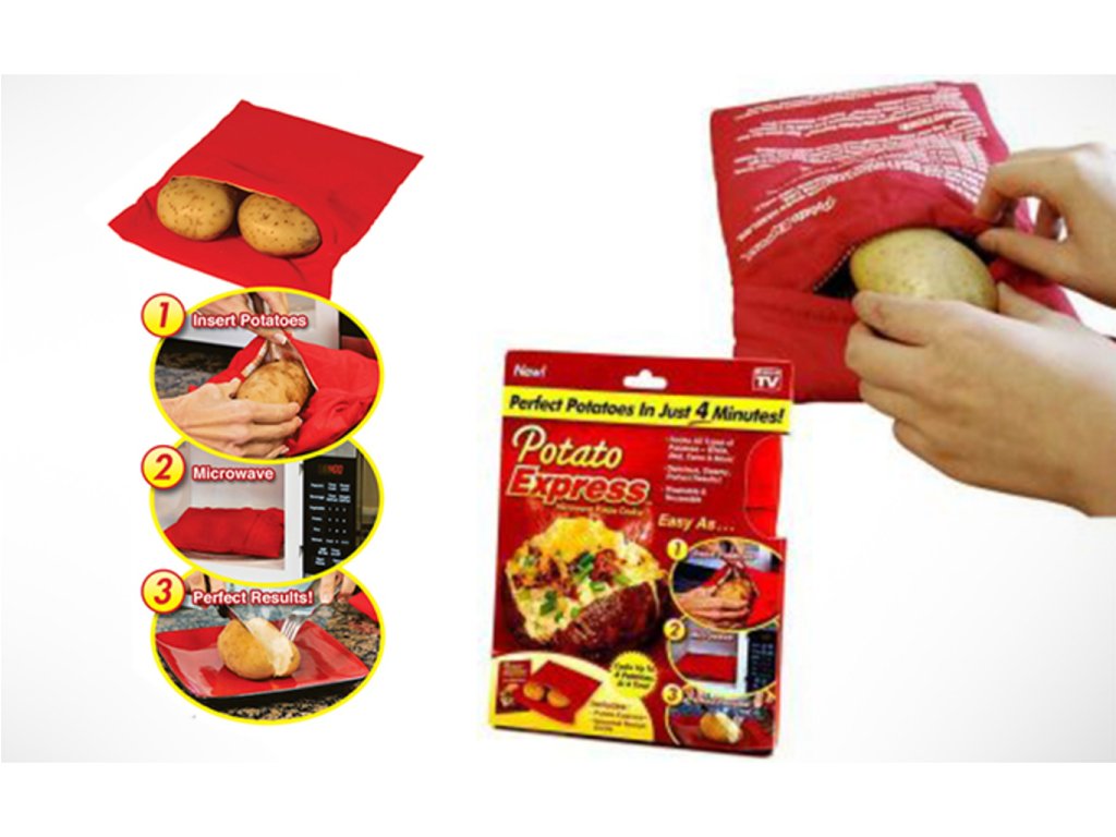Představujeme Vám novinku, kterou ocení každá hospodyňka. Sáček na vaření brambor v mikrovlnce je šikovná a praktická pomůcka do kuchyně. Díky speciální kapse uvaříte 4 středně velké brambory ve slupce v mikrovlnce už za 4 minuty. Zapomeňte na dlouhé vaření v hrnci. Potřebujete brambory uvařit hned? Stačí je vložit do sáčku a za chvíli je hotovo. Kromě brambor můžete v sáčku také rozpékat chleba, nebo vařit tortily. Sáček je z nezávadného materiálu. Sáček na vaření brambor v mikrovlnce je originální dárek pro kuchaře a hospodyňky.