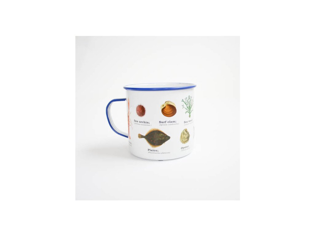 An enamel mug featuring a fine selection of our most recognisable sea life creatures.