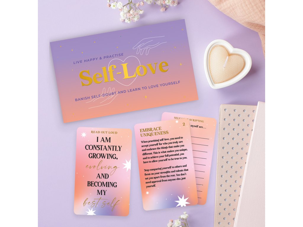 Self-Love Cards Description: Know someone in the need of a bit of self-love? This set of 100 cards features exercises, affirmations and guidance on how to build self-confidence and live a happier, self-accepting lifestyle. Packaging: Cardboard Box Dims:9x16x3.5cm Product Info: 100 CardsDoplňkové parametry