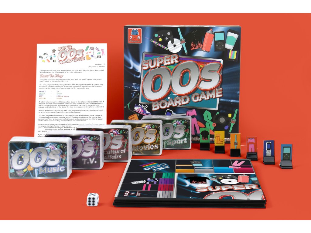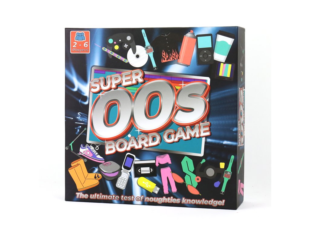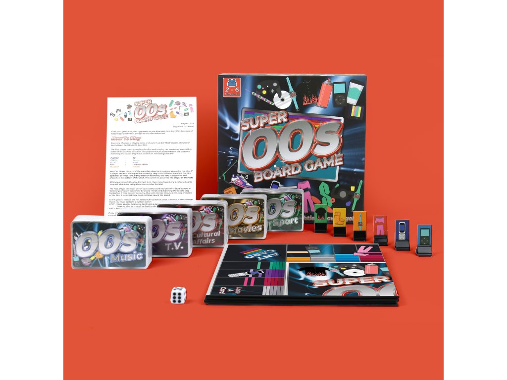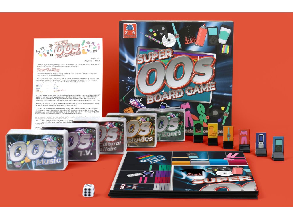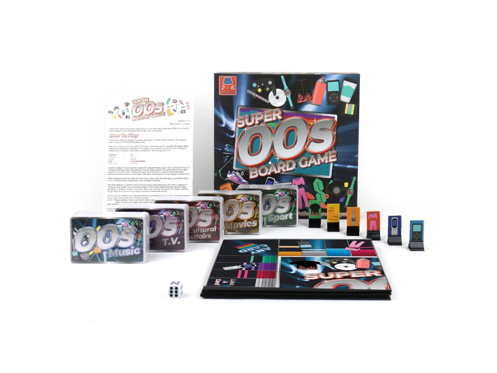 Super 00s Board Game Description: Grab your flip phones and frost those tips as you re-enter the world of the 2000’s in this totally radical board game featuring fascinating trivia questions on 00’s music, T.V., movies, sport and cultural affairs! Dims: 24.6 x 24.6 x 6.7 cm Product Info: 1x Board, 500x trivia cards, 6x game pieces, 1x 6 sided dice, instructionsDoplňkové parametry
