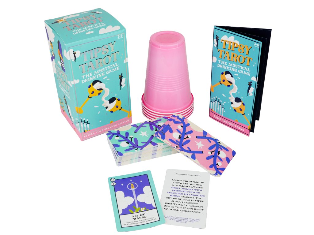 Tipsy Tarot – Drinking Game Reveal your drunken destiny in this game of skill, wit and fortune. Each player must race to get rid of their cards. The first player to do so, will be crowned the winner. Along your journey, you will be faced with trickery, deceit, forfeits and drunkenness. Will fortune favour you? Dims: 18x10x10cm Product Info: 90 Tipsy tarot cards, 5 cups and drinking instructions.Doplňkové parametry