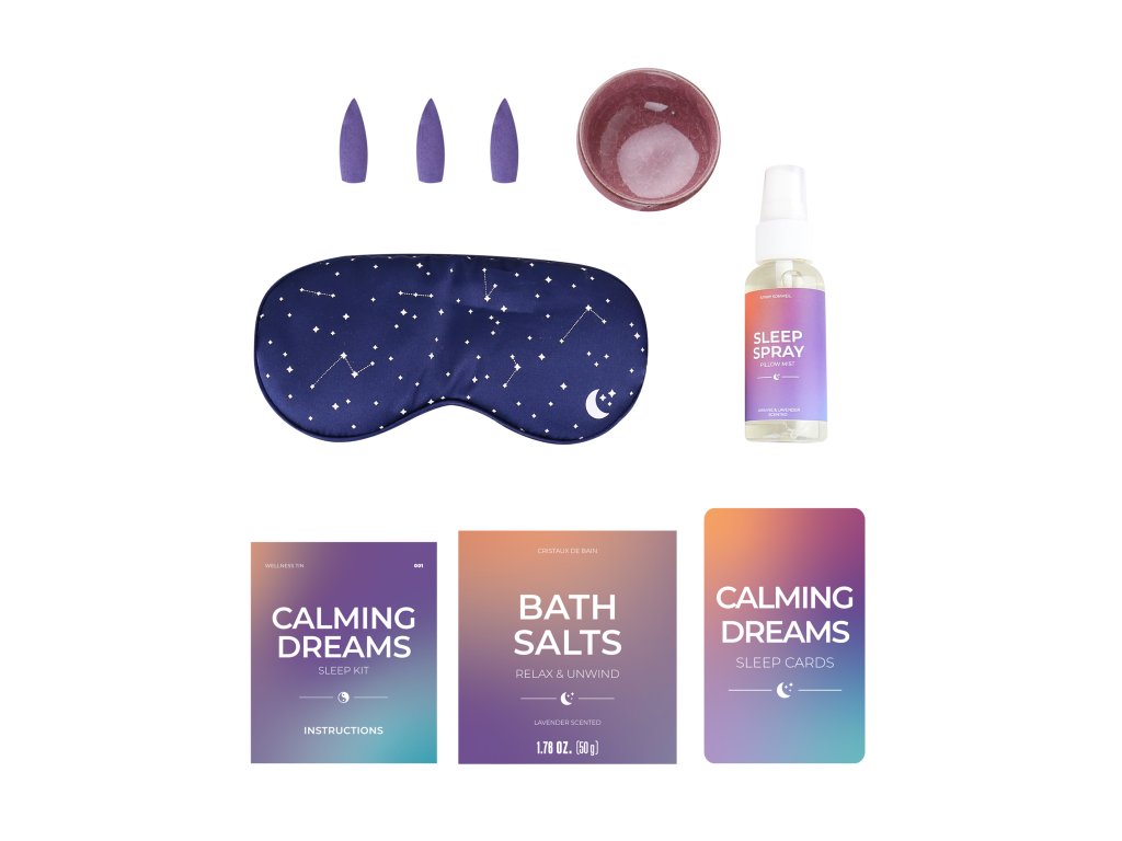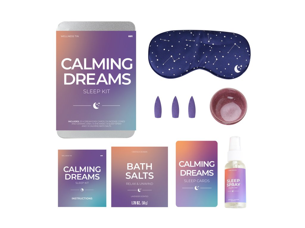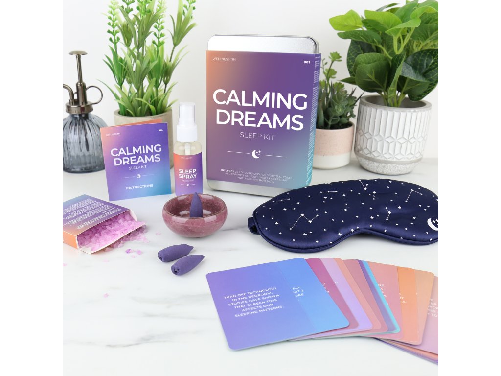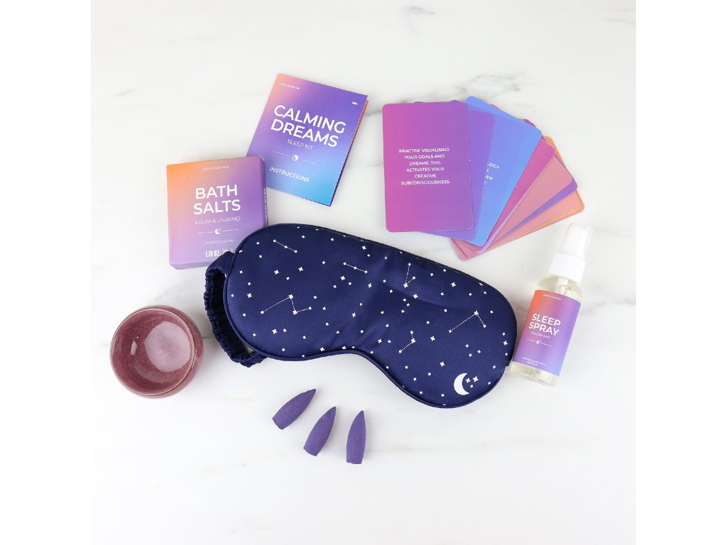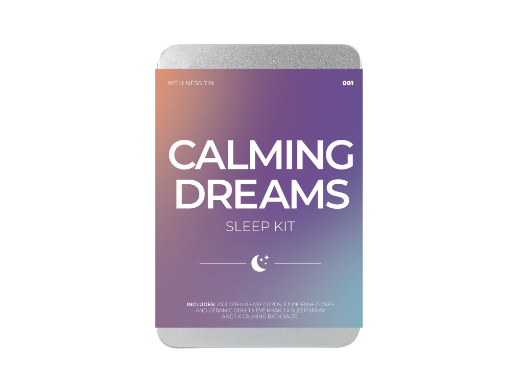 Calming Dreams Description: Sleep easy at night with the help of the dream easy wellness sleep kit. The kit is designed to help you mindfully drift off at night after a stressful day. From running a bath to misting your pillow this kit has everything you need to relax. Packaging: cardboard wrap over tin Dims: 18.5x12x4.5cm Product Info: 20 x dream easy cards, 3 x incense cones and ceramic dish, eye mask, sleep spray and calming bath salts.Doplňkové parametry